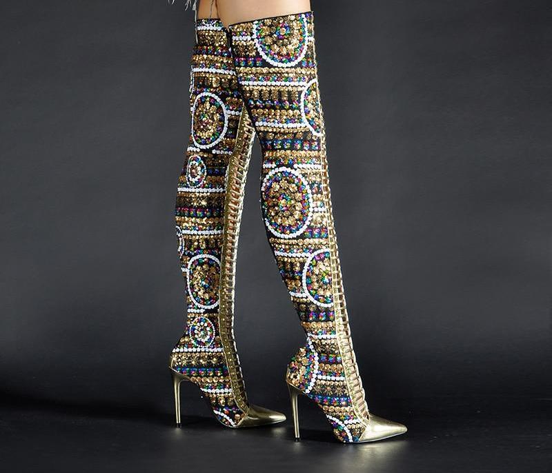 Get ready to party in these high heeled-sparkle sequin and metallic boots. As sexy as they are flashy. this Classic thigh high sequin heel is everything a girl could want in a boot.