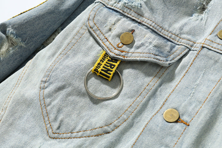 Broken hole retro hip hop denim jacket loose stitching ribbon casual men and women tide brand jacket