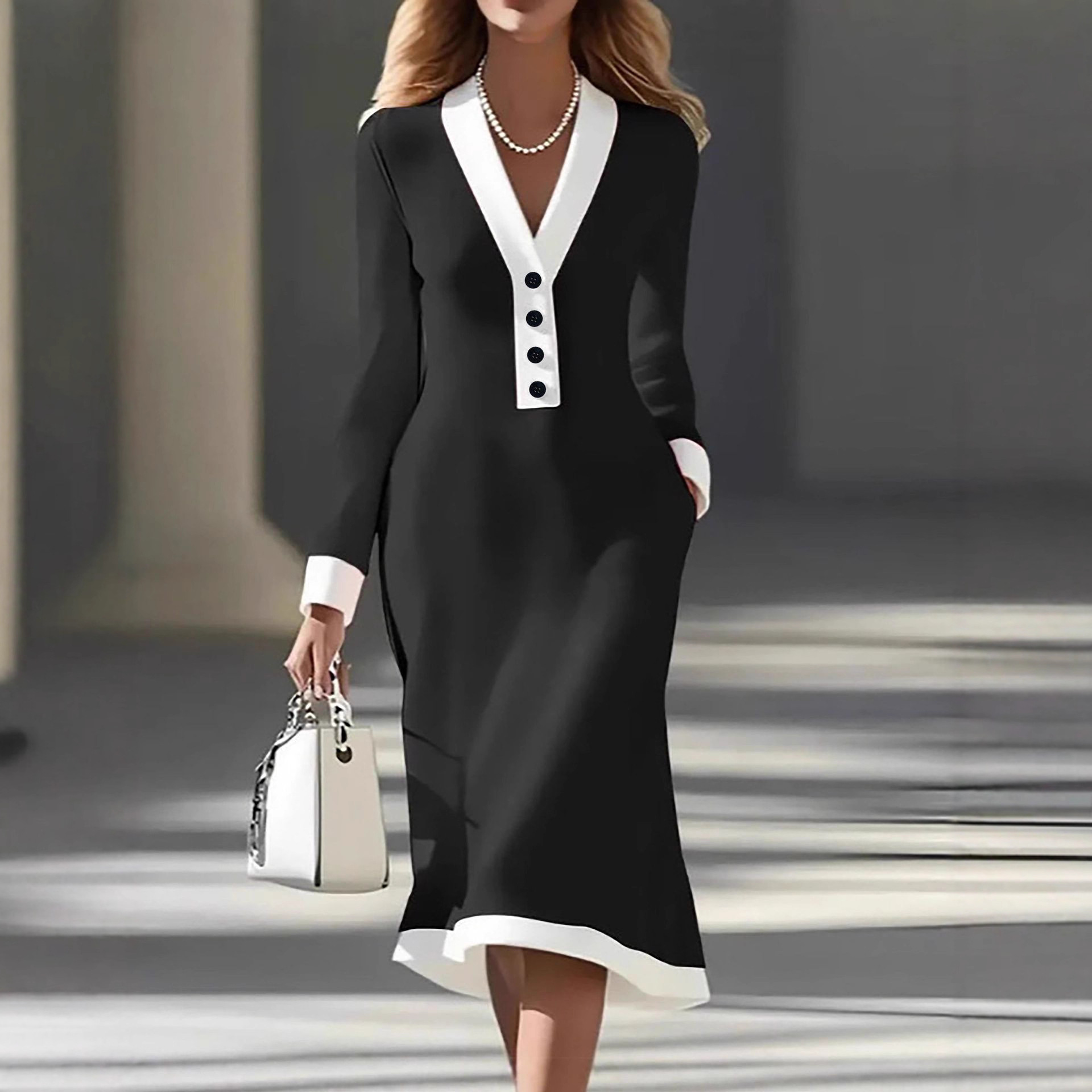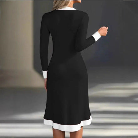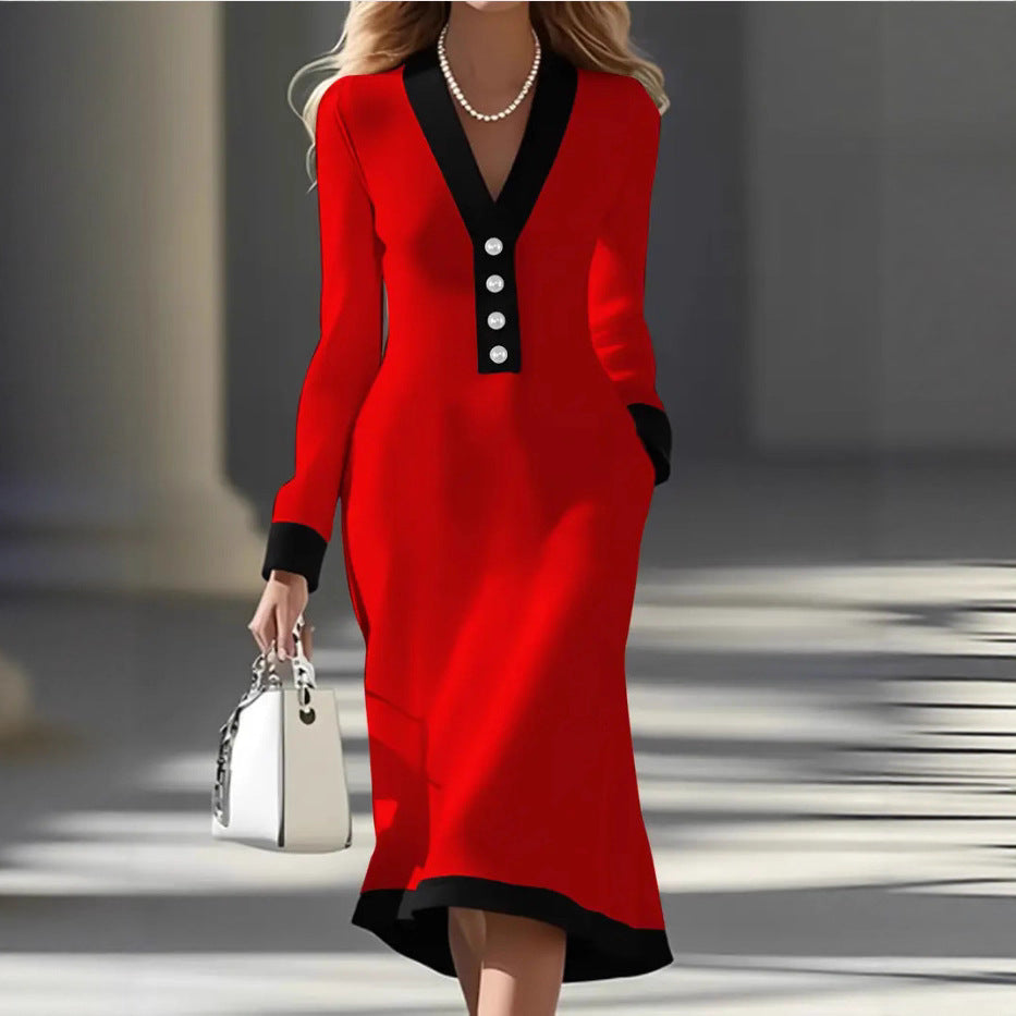 Commuting Color-block V-neck Midi Dress Casual