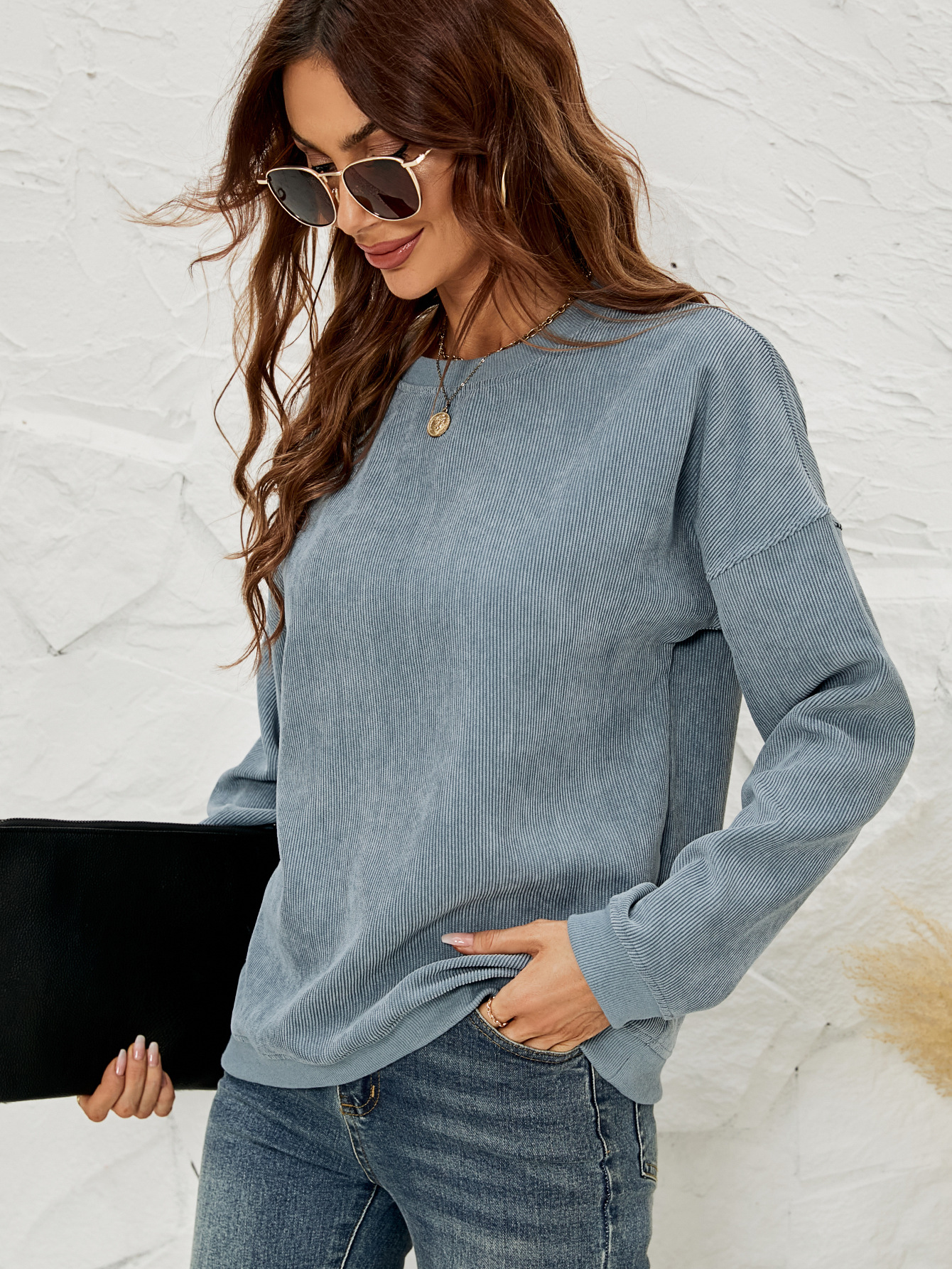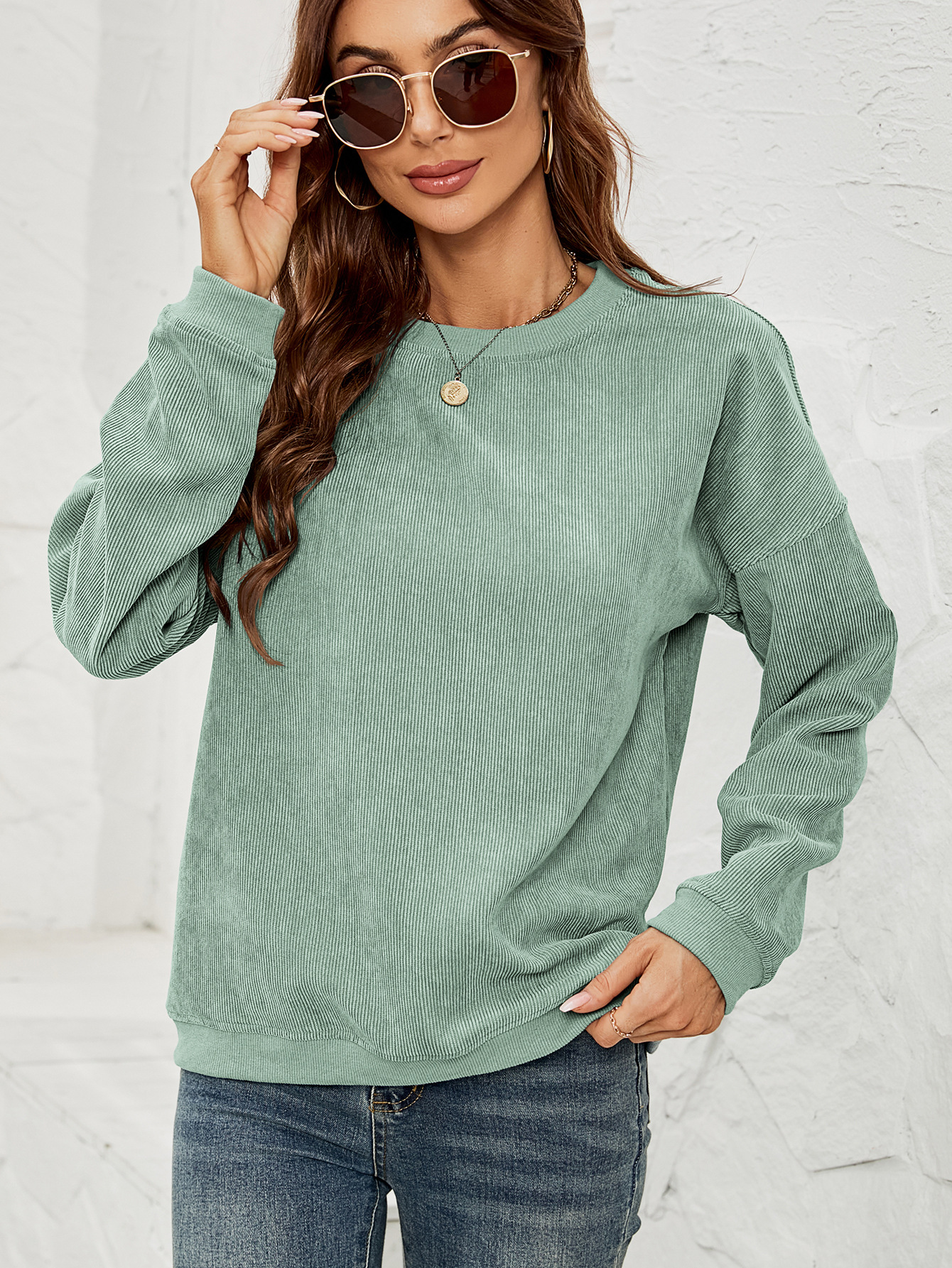 • Corduroy Pullover Sweatshirt Casual Fashion Solid Round Neck Long-sleeved Tops Spring And Autumn Clothing For Women