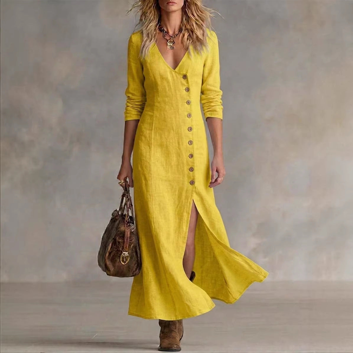 Features: Solid color, side-slit design, maxi length, slim fit, mid-rise waist