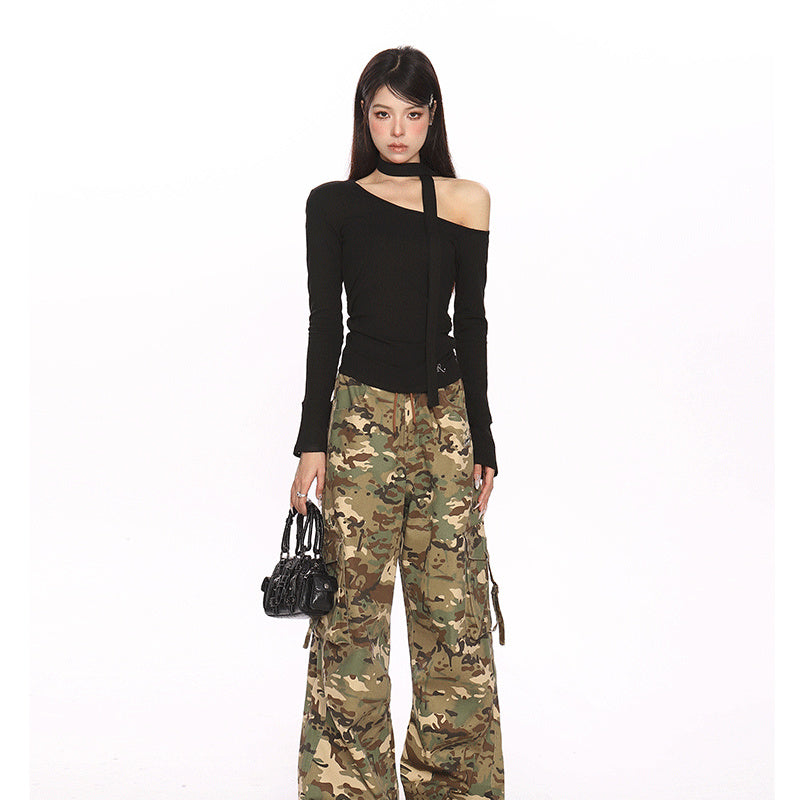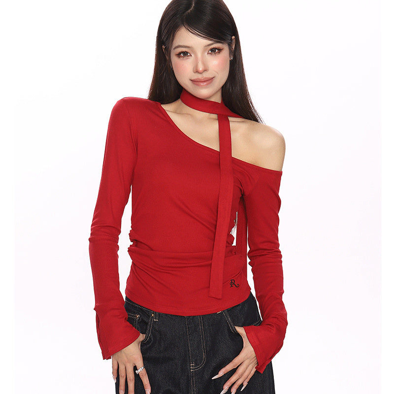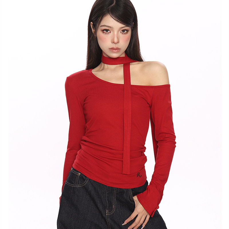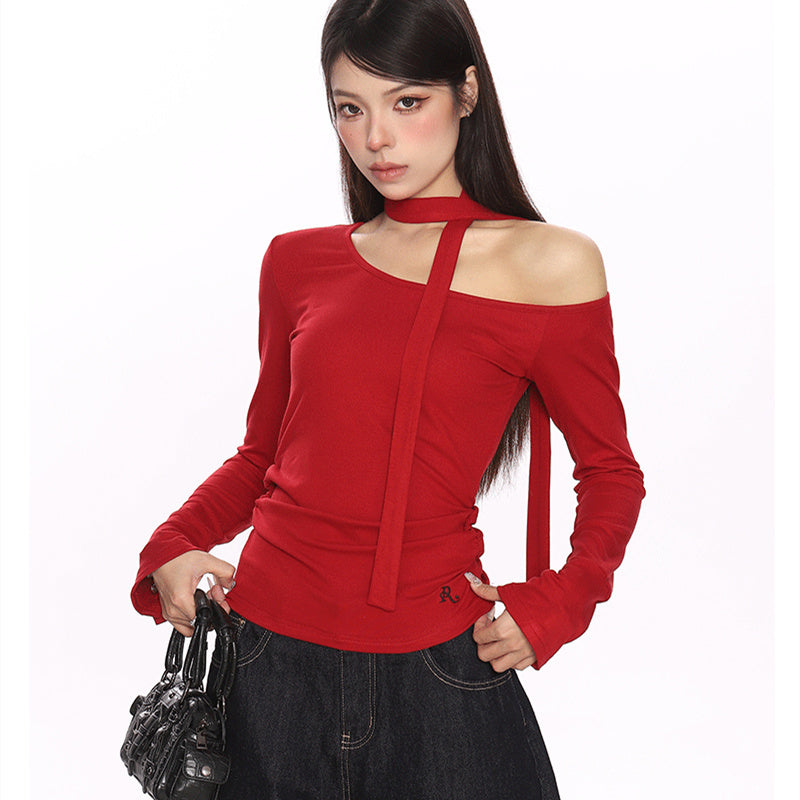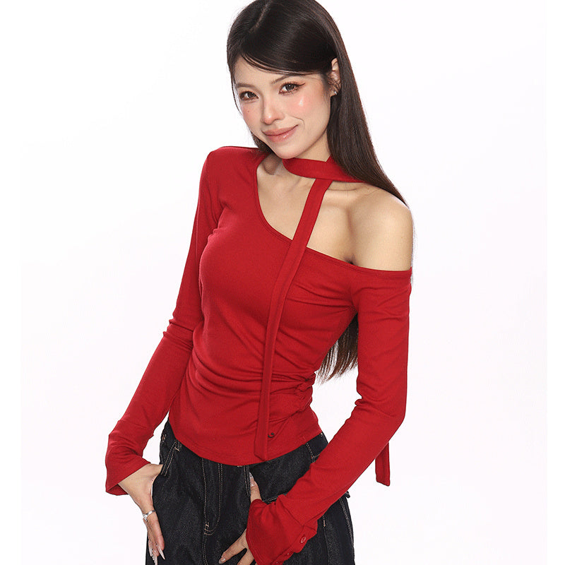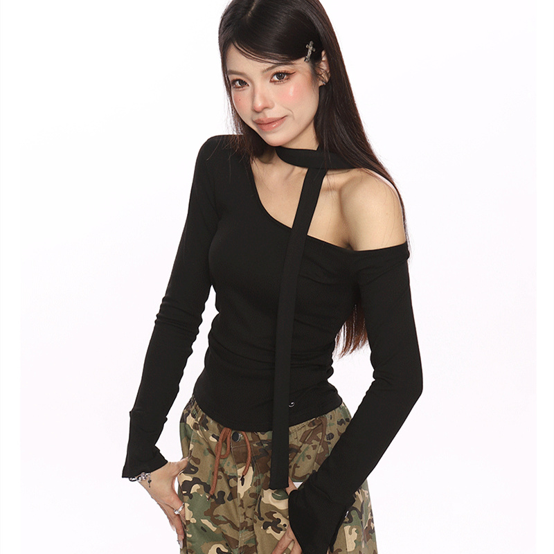 • Female Off Shoulder Hanging Neck Slanted Shoulder Long Sleeved T-shirt