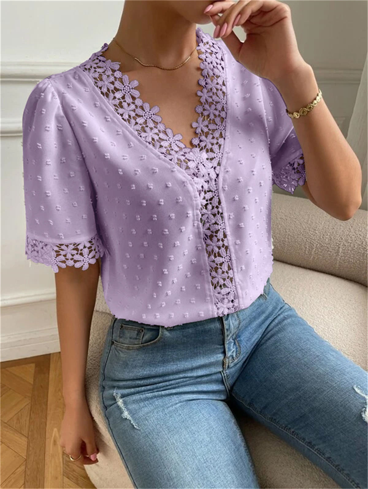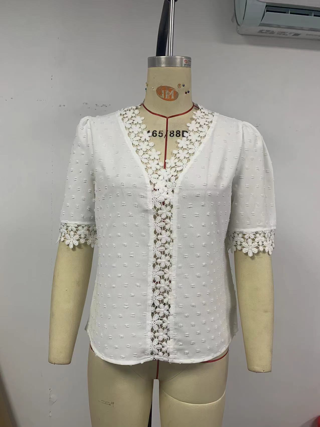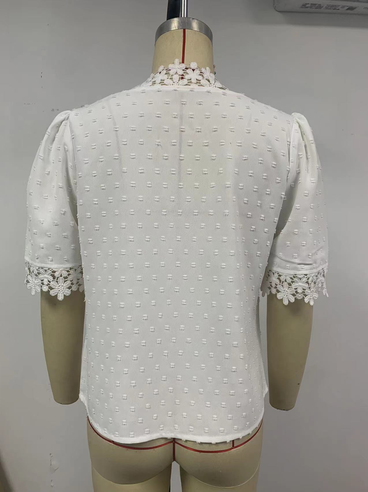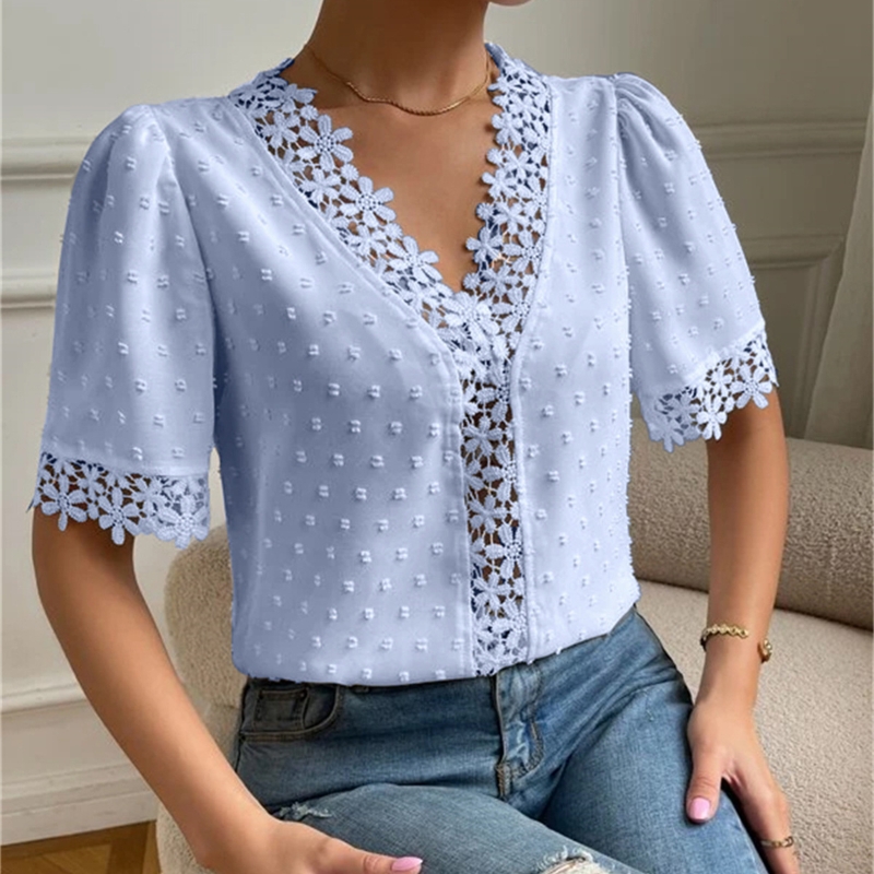 • Floral Lace Short Sleeve Shirt Summer Fashion V-Neck Tops Women's Clothing
