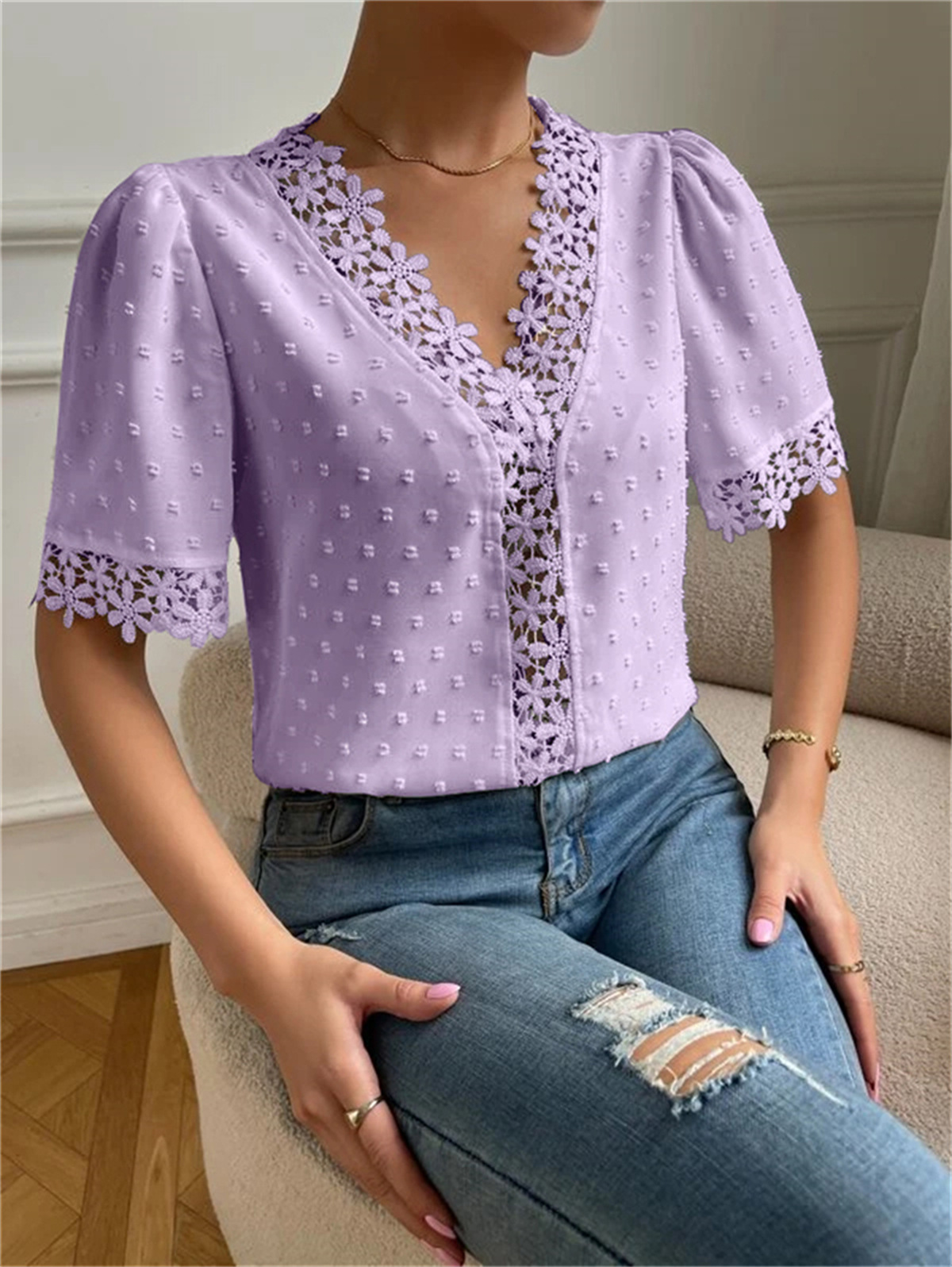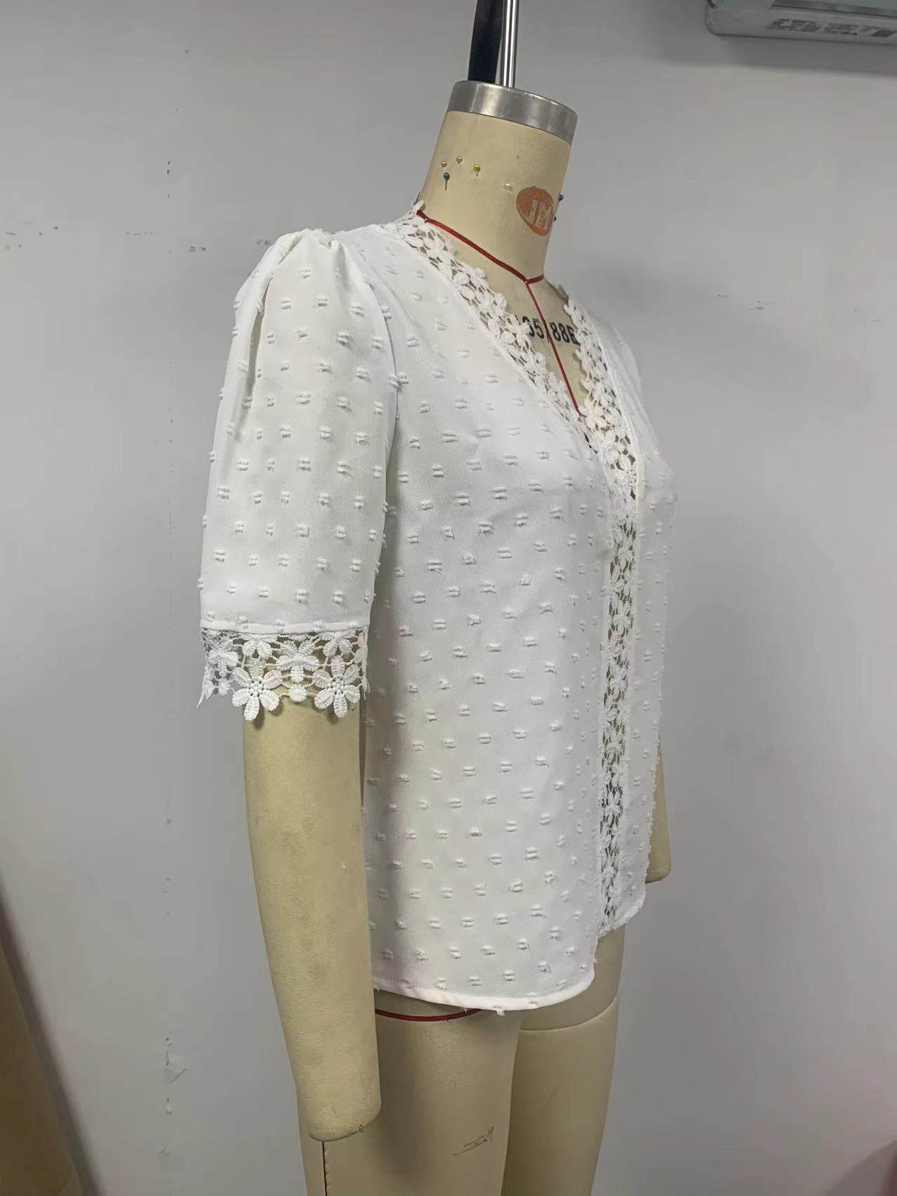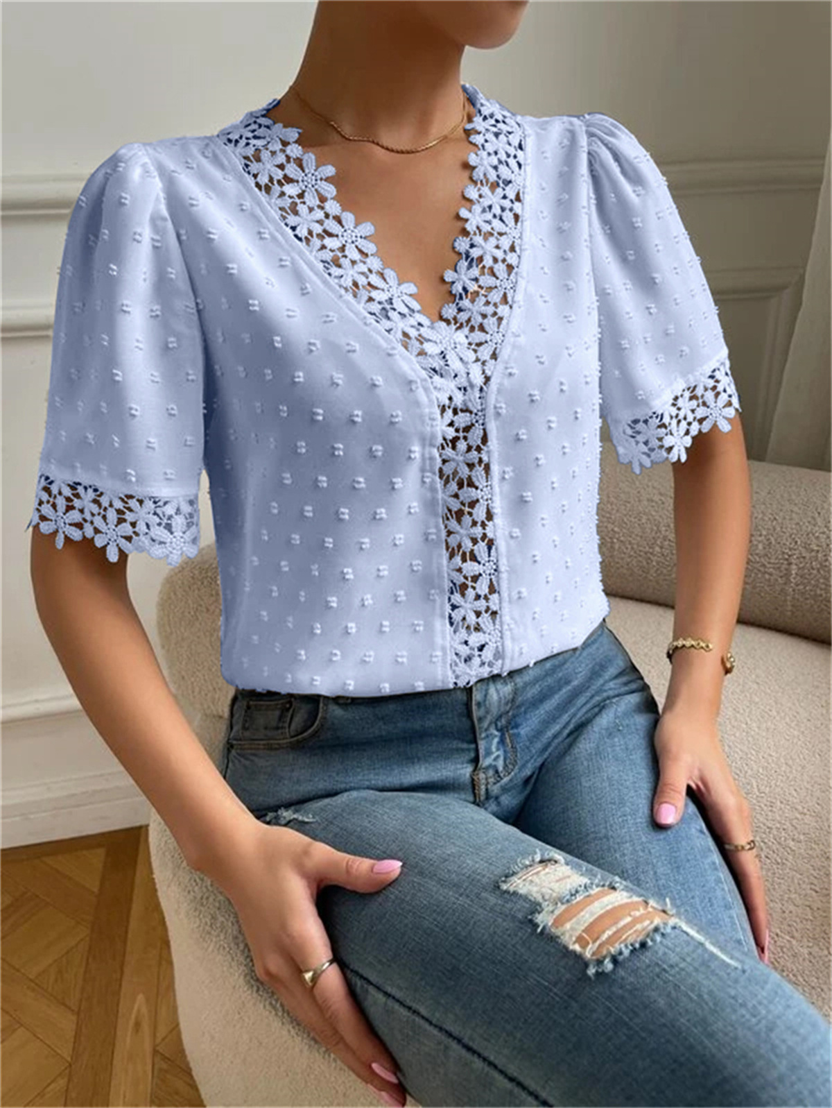 • Floral Lace Short Sleeve Shirt Summer Fashion V-Neck Tops Women's Clothing