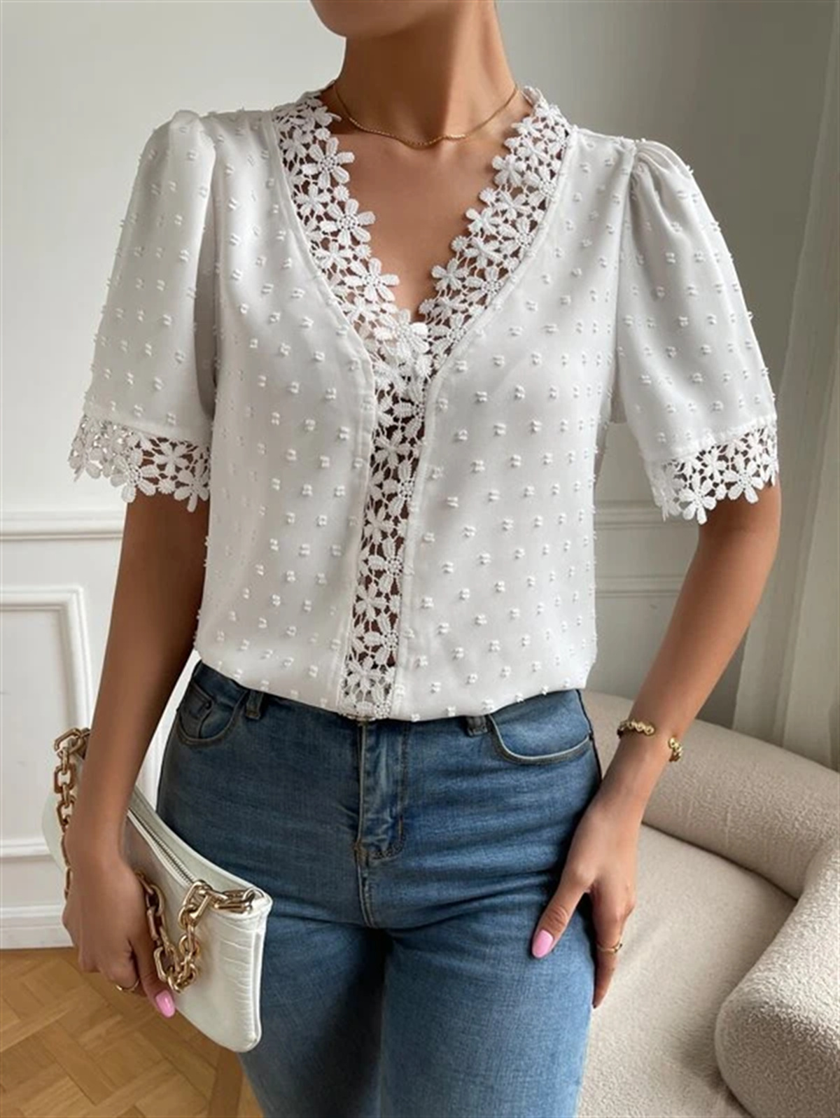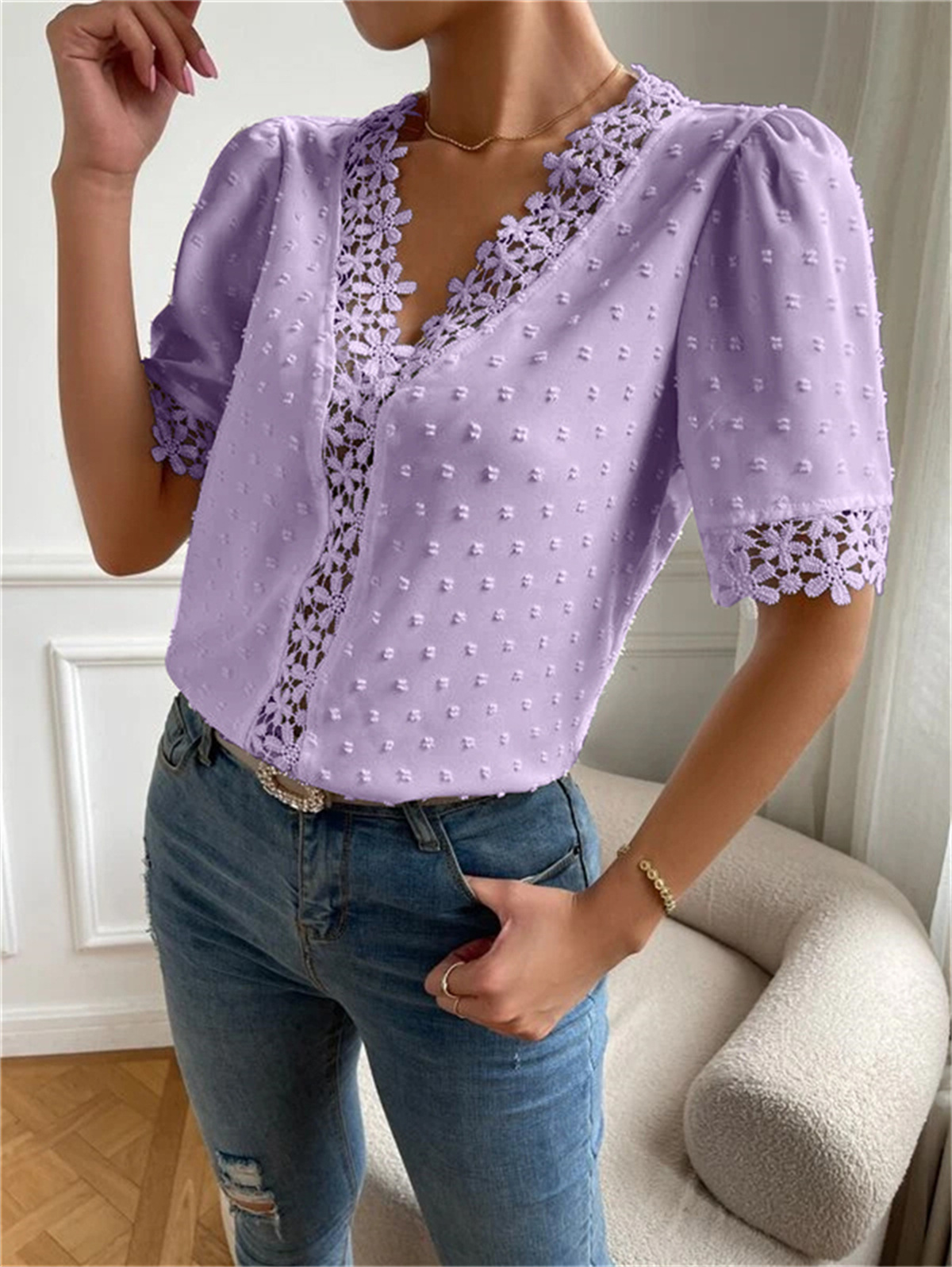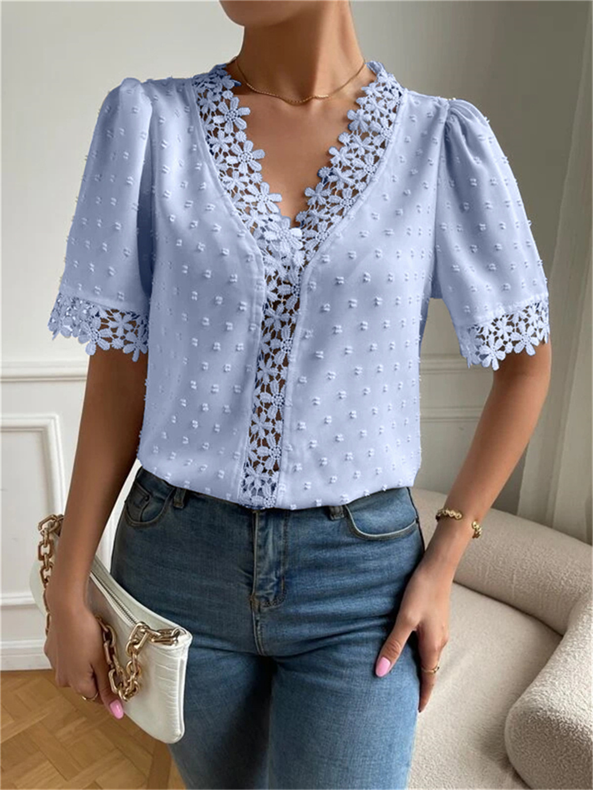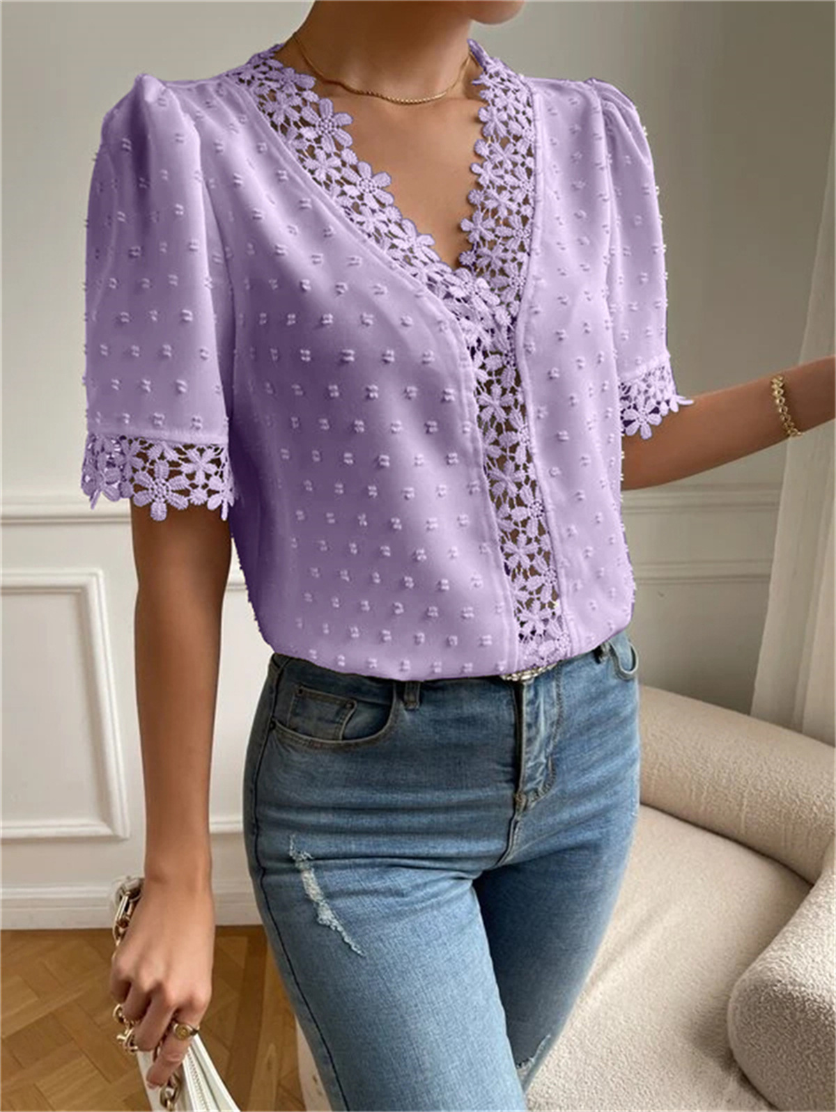 • Floral Lace Short Sleeve Shirt Summer Fashion V-Neck Tops Women's Clothing