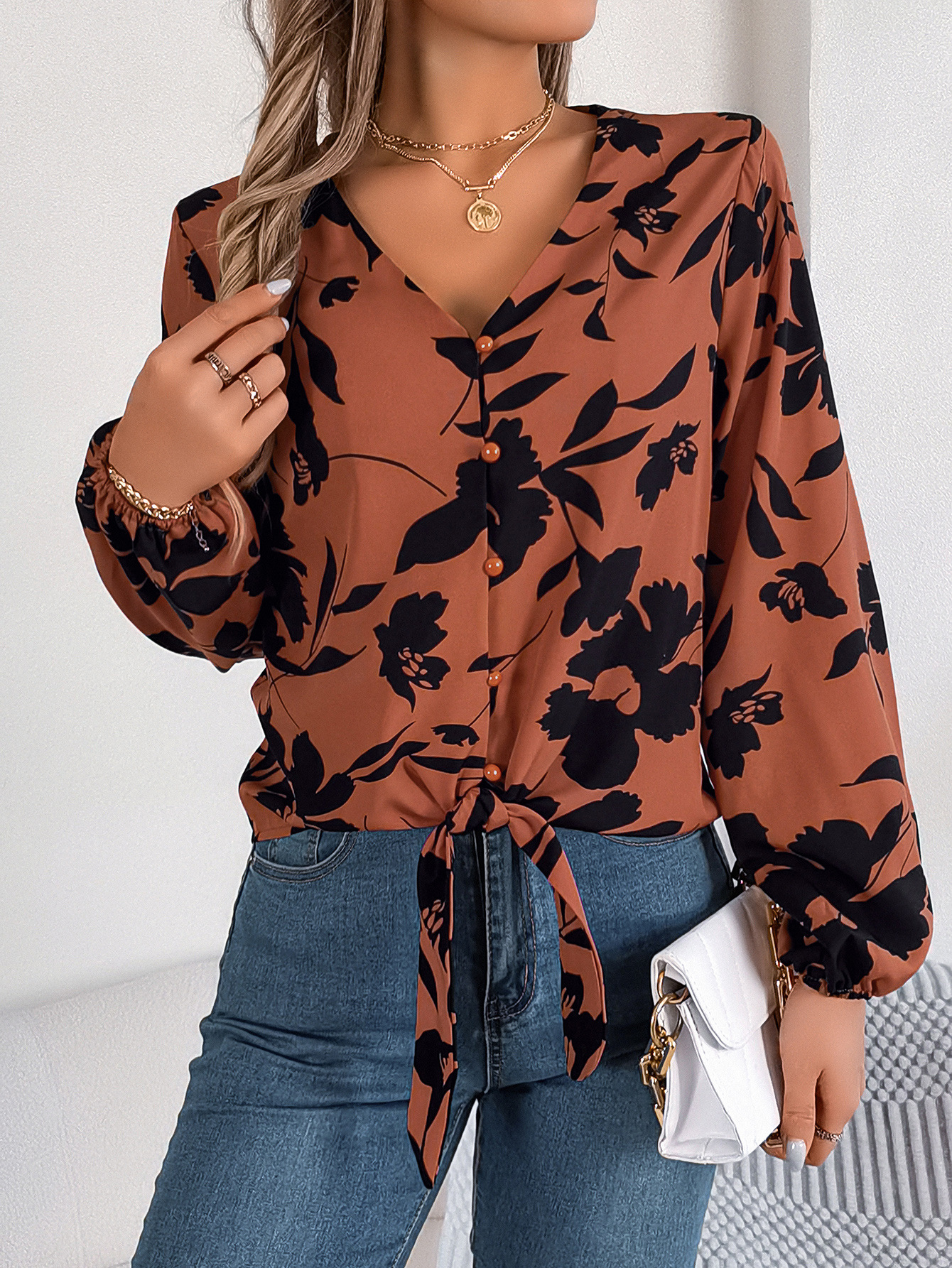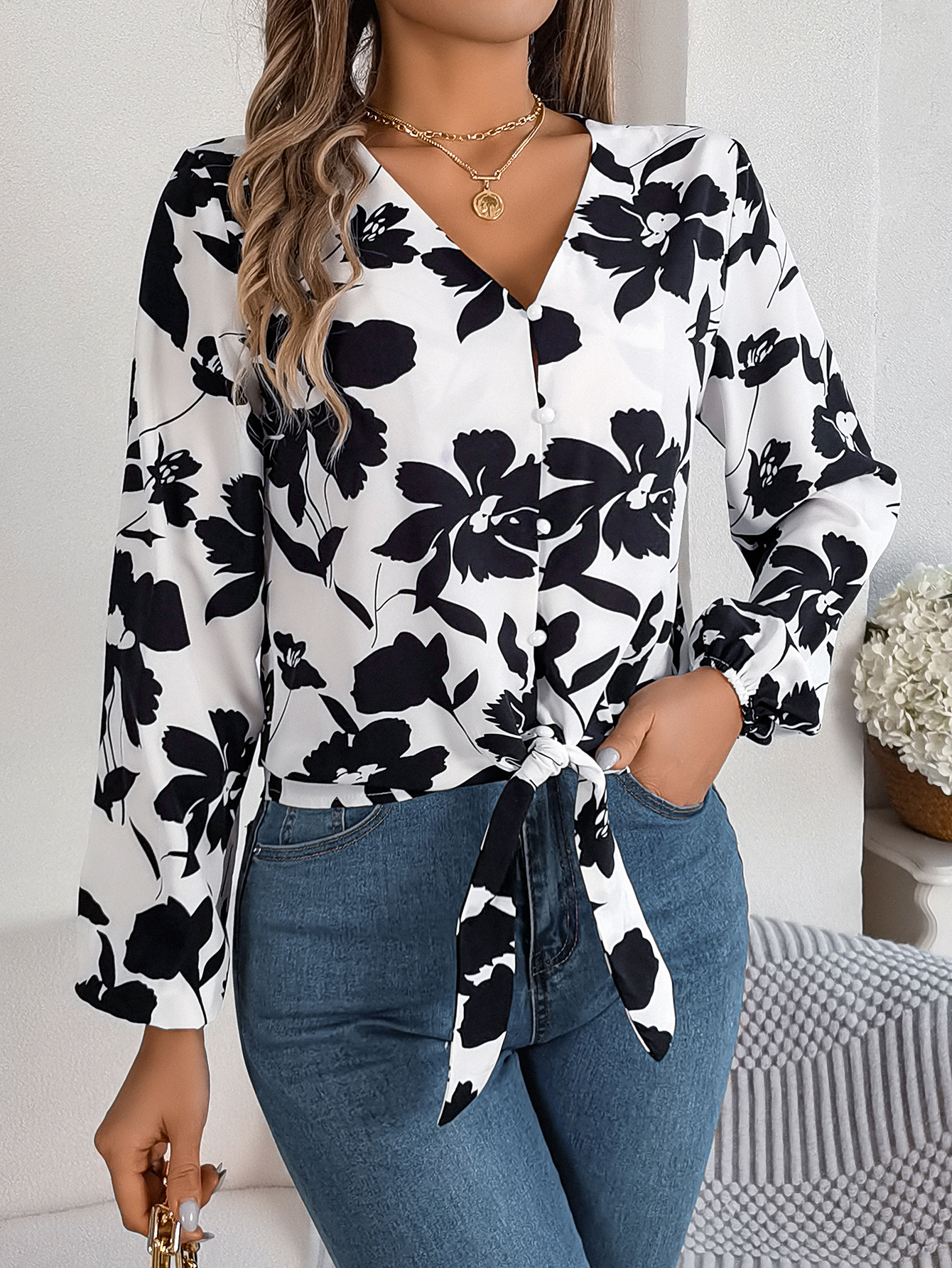 Floral Lantern-sleeve Lace-up Chiffon Blouse Top
