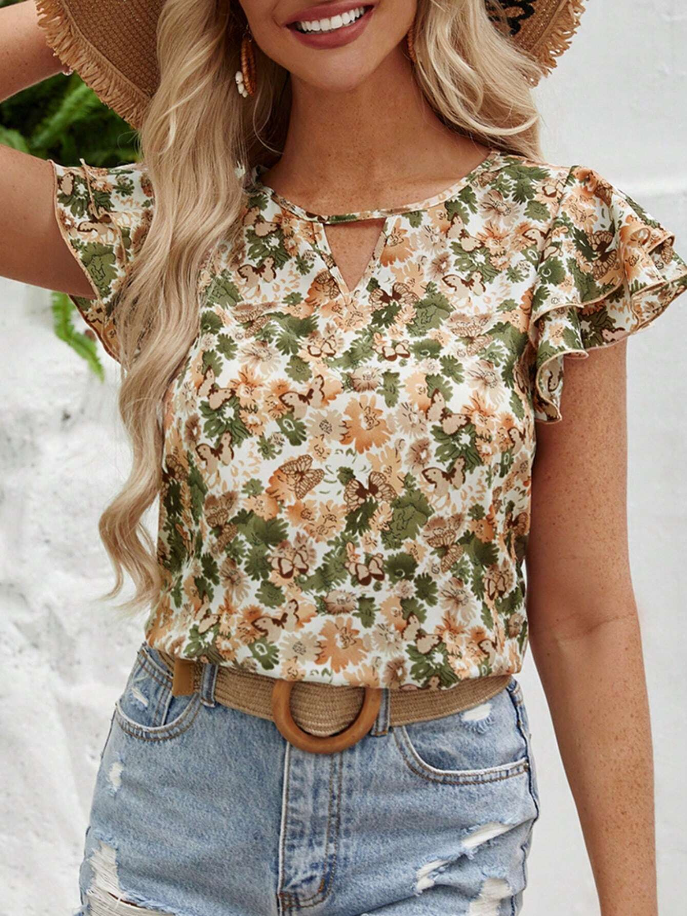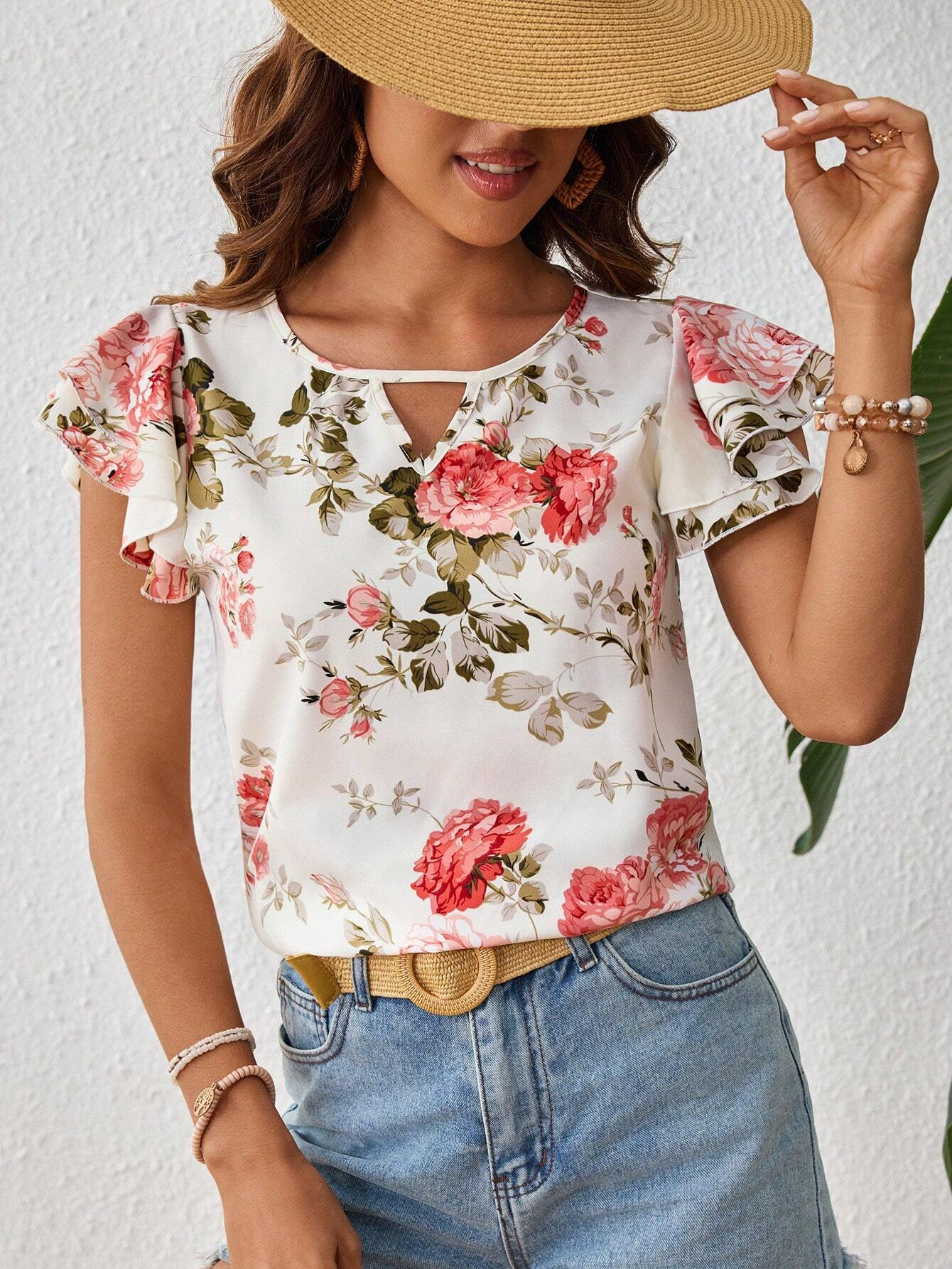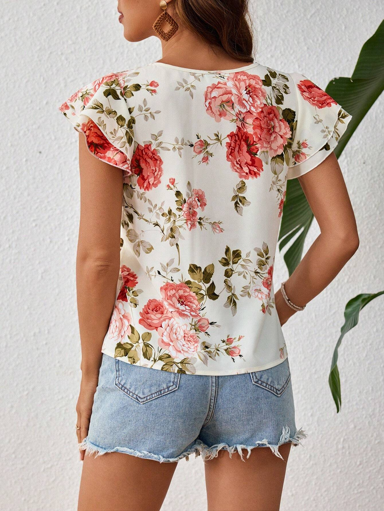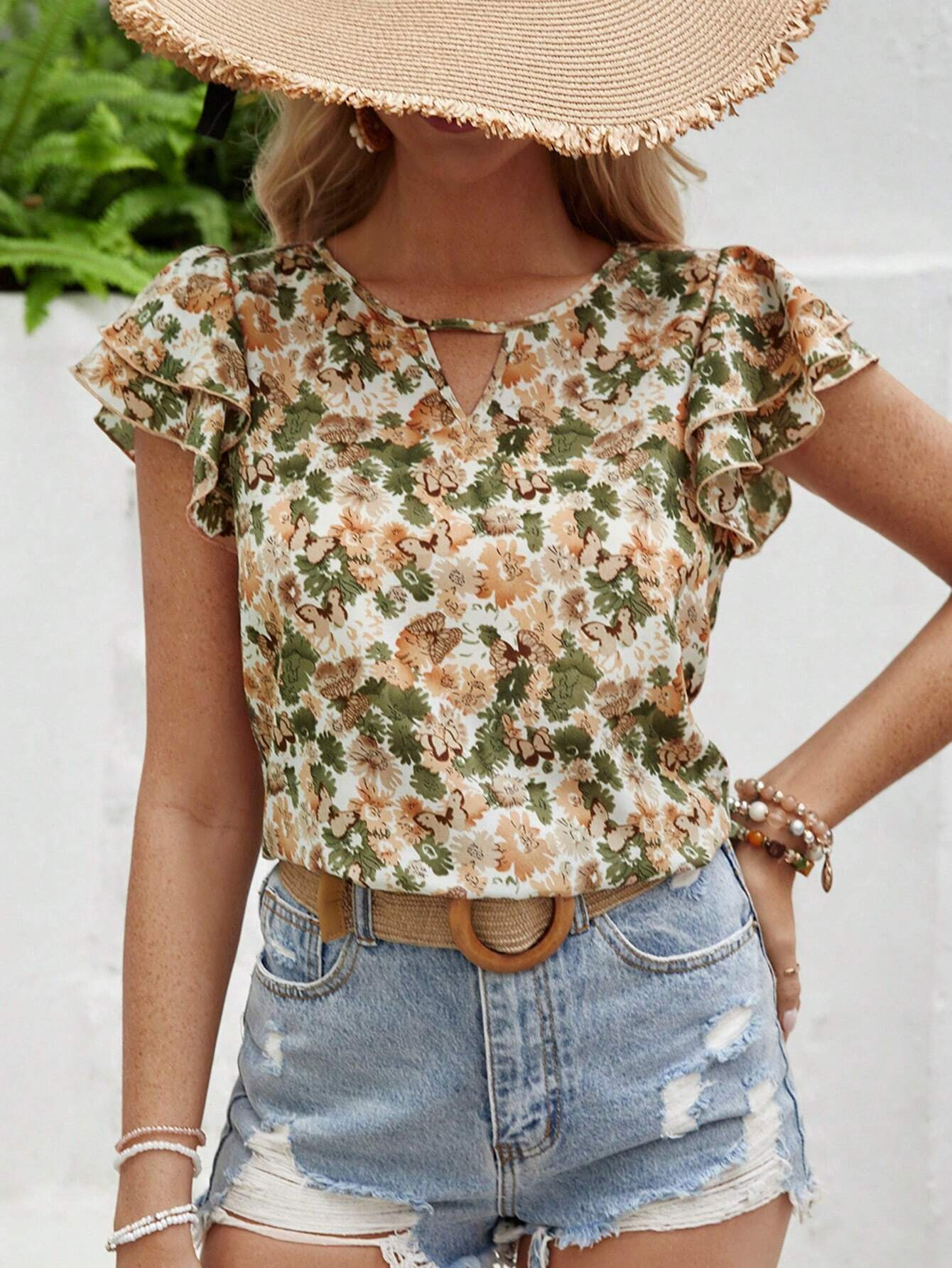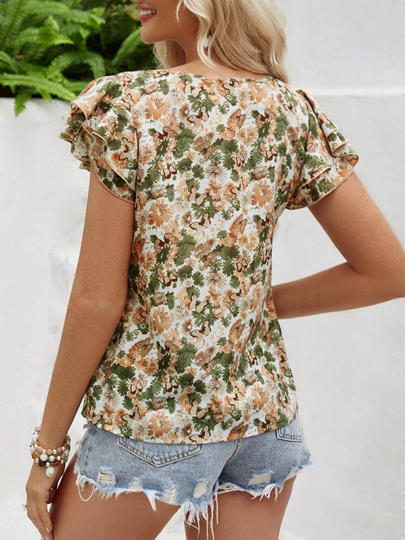 • Floral Print Short Sleeve Shirt Summer Fashion Ruffled Tops Women's Clothing