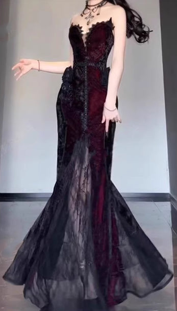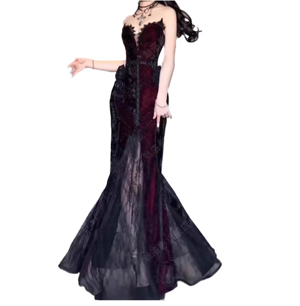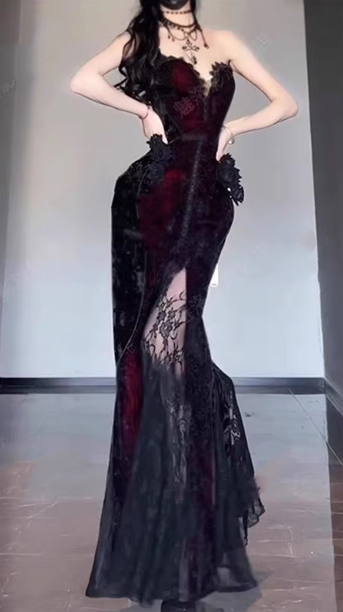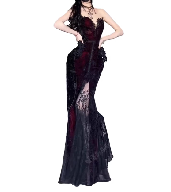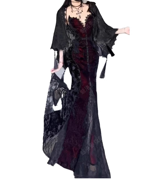 • French-style Dark Slimming Lace Patchwork Dress Womens Two-piece Set Sexy Chic Tassel Shawl Long Skirt