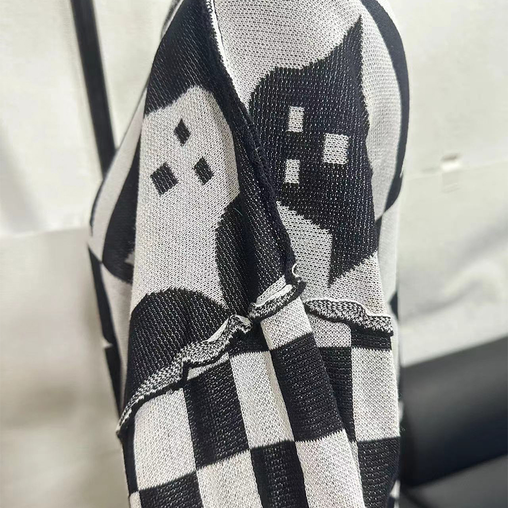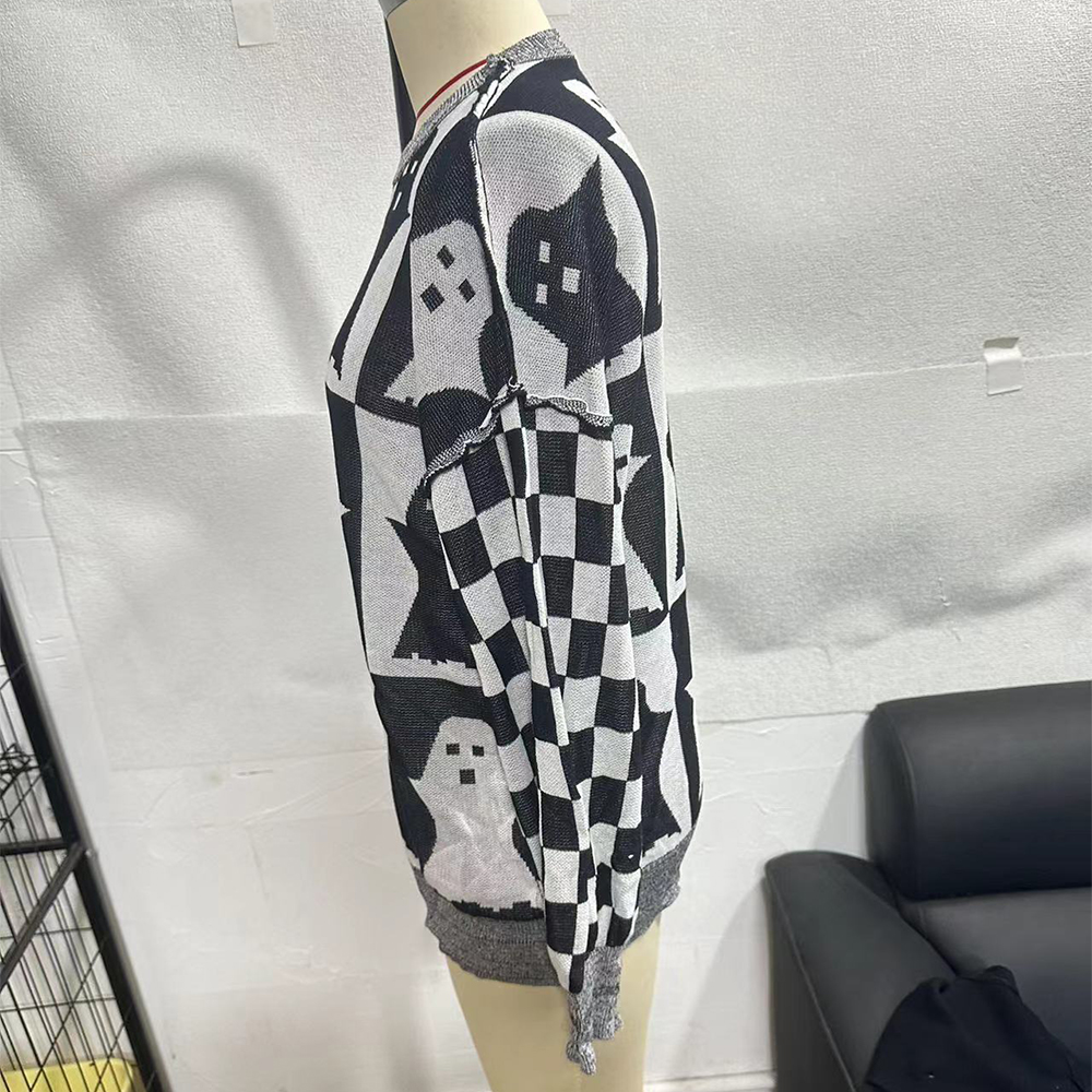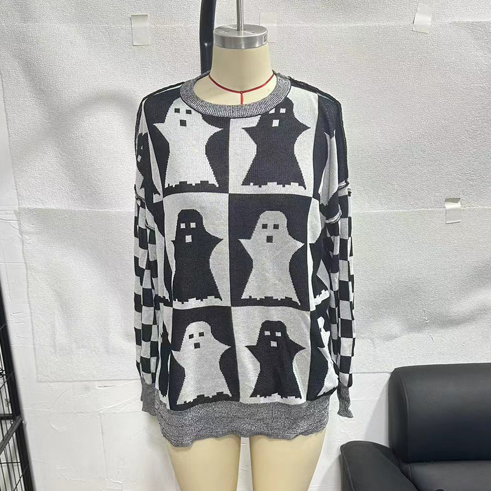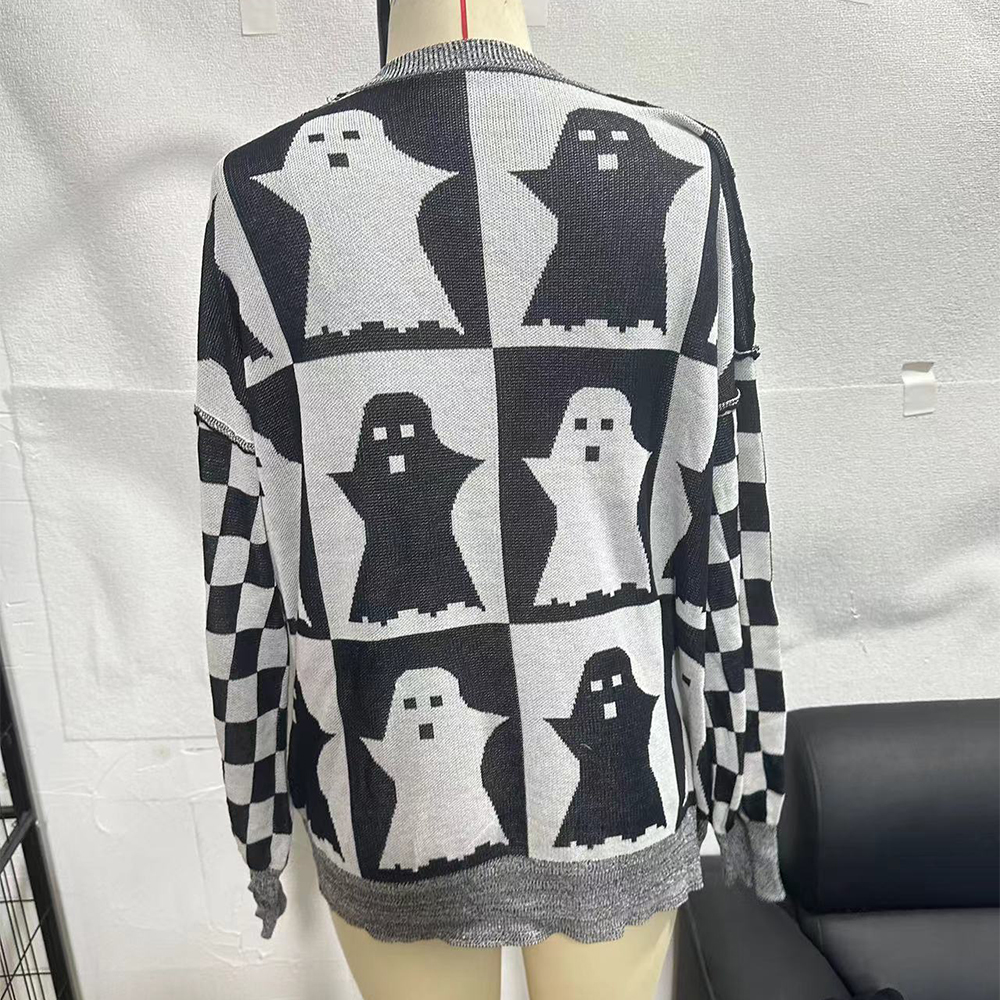 • Halloween Cartoon Ghost And Checkerboard Print Pullover Sweater Autumn And Winter Loose Long-sleeved Knitted Tops For Women