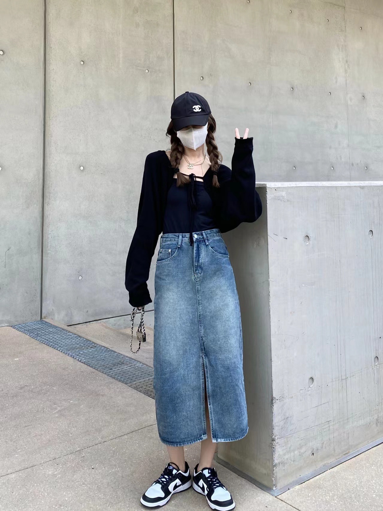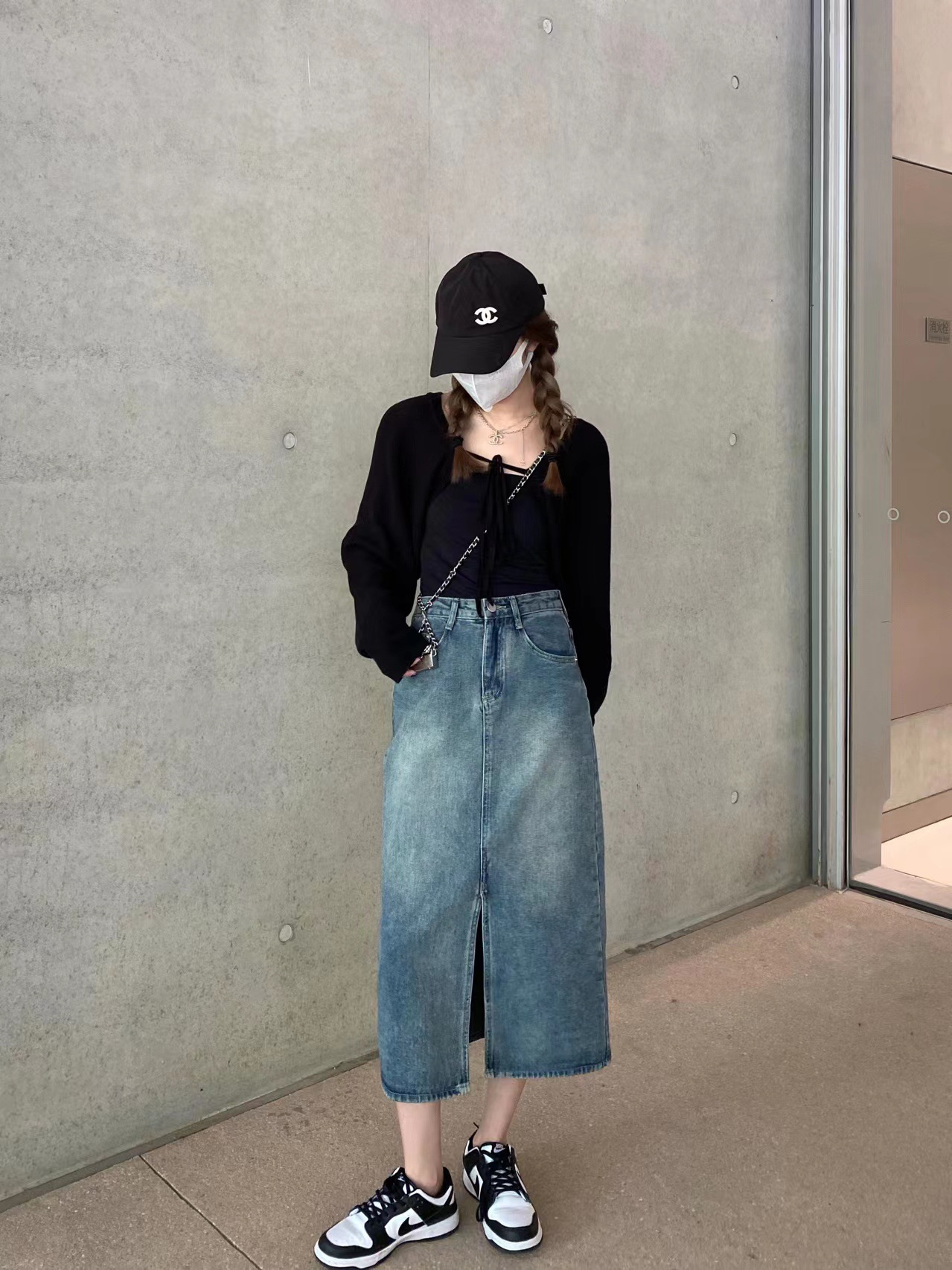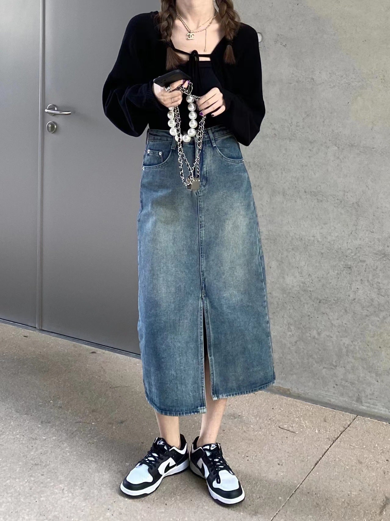 High Waist Slit Denim Skirt Sheath Mid-length Skirt
