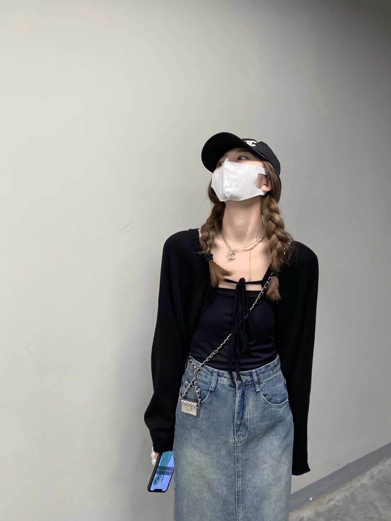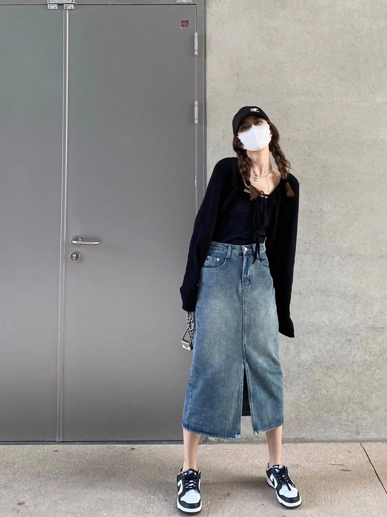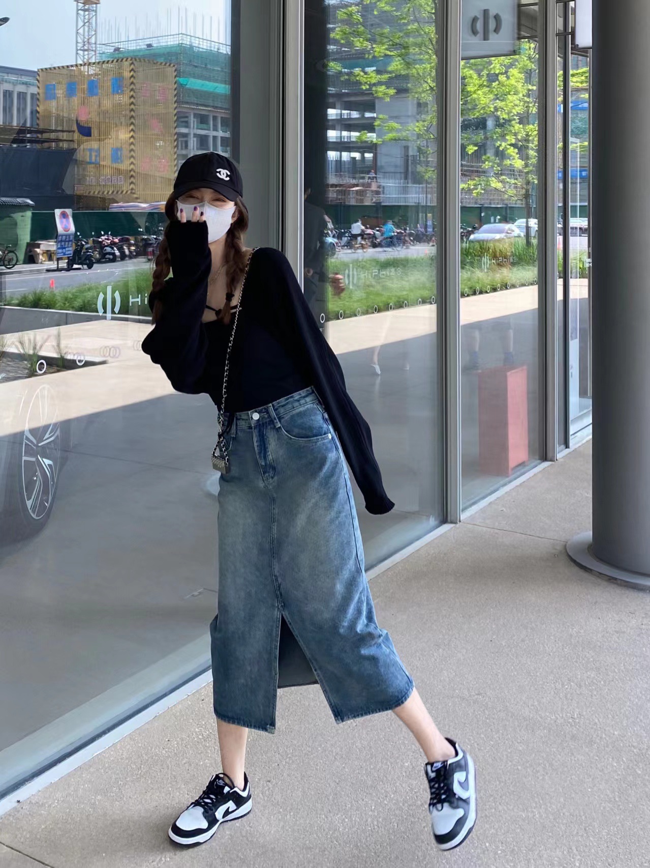 High Waist Slit Denim Skirt Sheath Mid-length Skirt