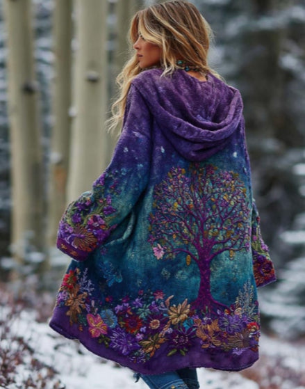 • Hooded Cardigan With Tree Of Life Print Long-sleeved Cardigan