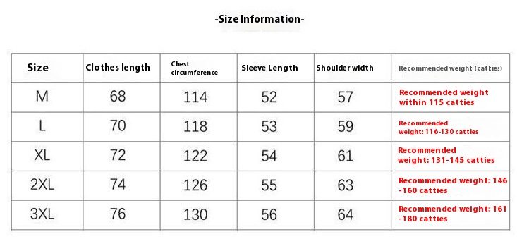 Size: M recommended within 115 Jin, L recommended 58.00 kg-65.00 kg, XL recommended 65.50 kg-72.50 kg, 2XL recommended 73.00 kg-80.00 kg, 3XL recommended 80.50 kg-90.00 kg