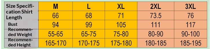 Sizes: M, L, XL, 2XL, 3XL
