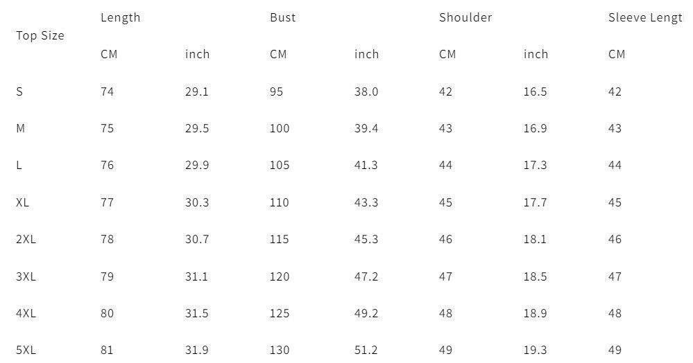 Sizes: S, M, L, XL, 2XL, 3XL, 4XL, 5XL