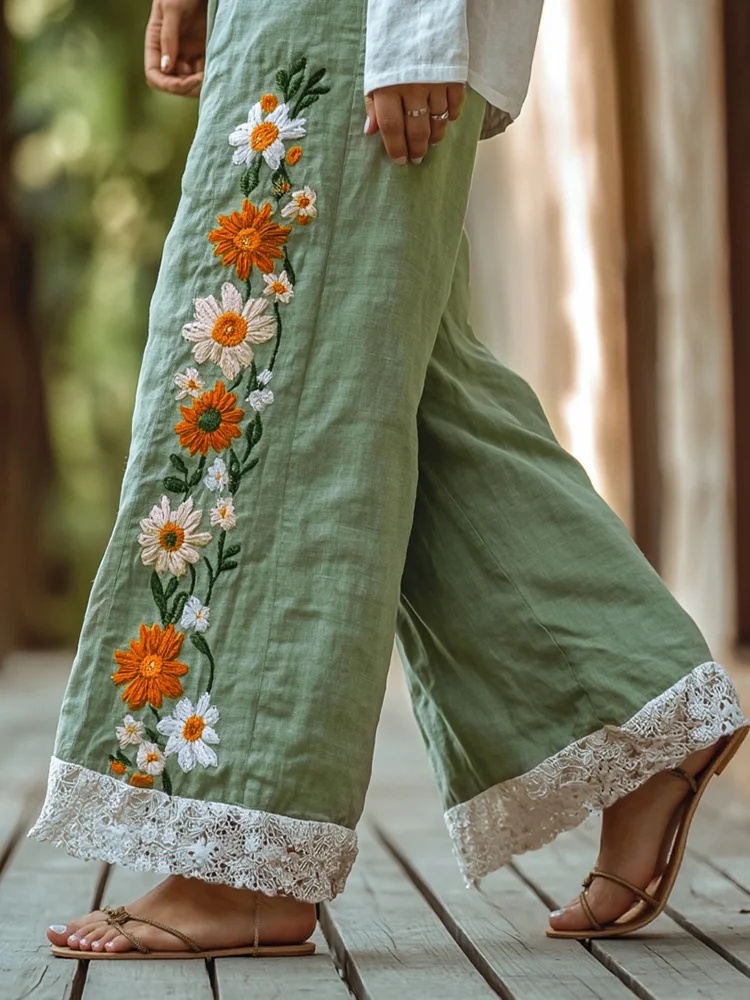 • Retro Boho Floral Lace Embroidery Art Cotton Linen Wide Leg Pants