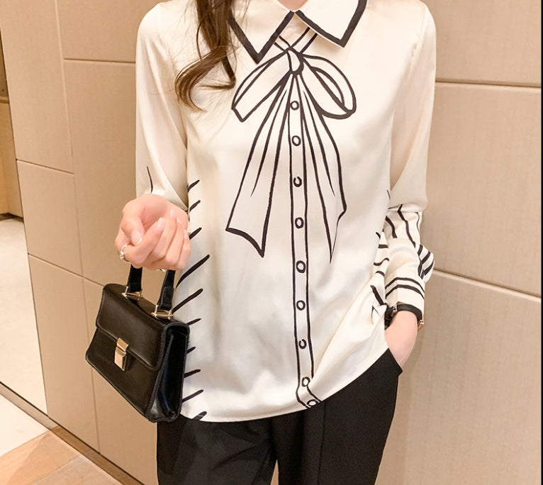 • Silk Blouse Women Fake Bow-knot Printing Blouse Satin Silk Long-sleeved Shirt
