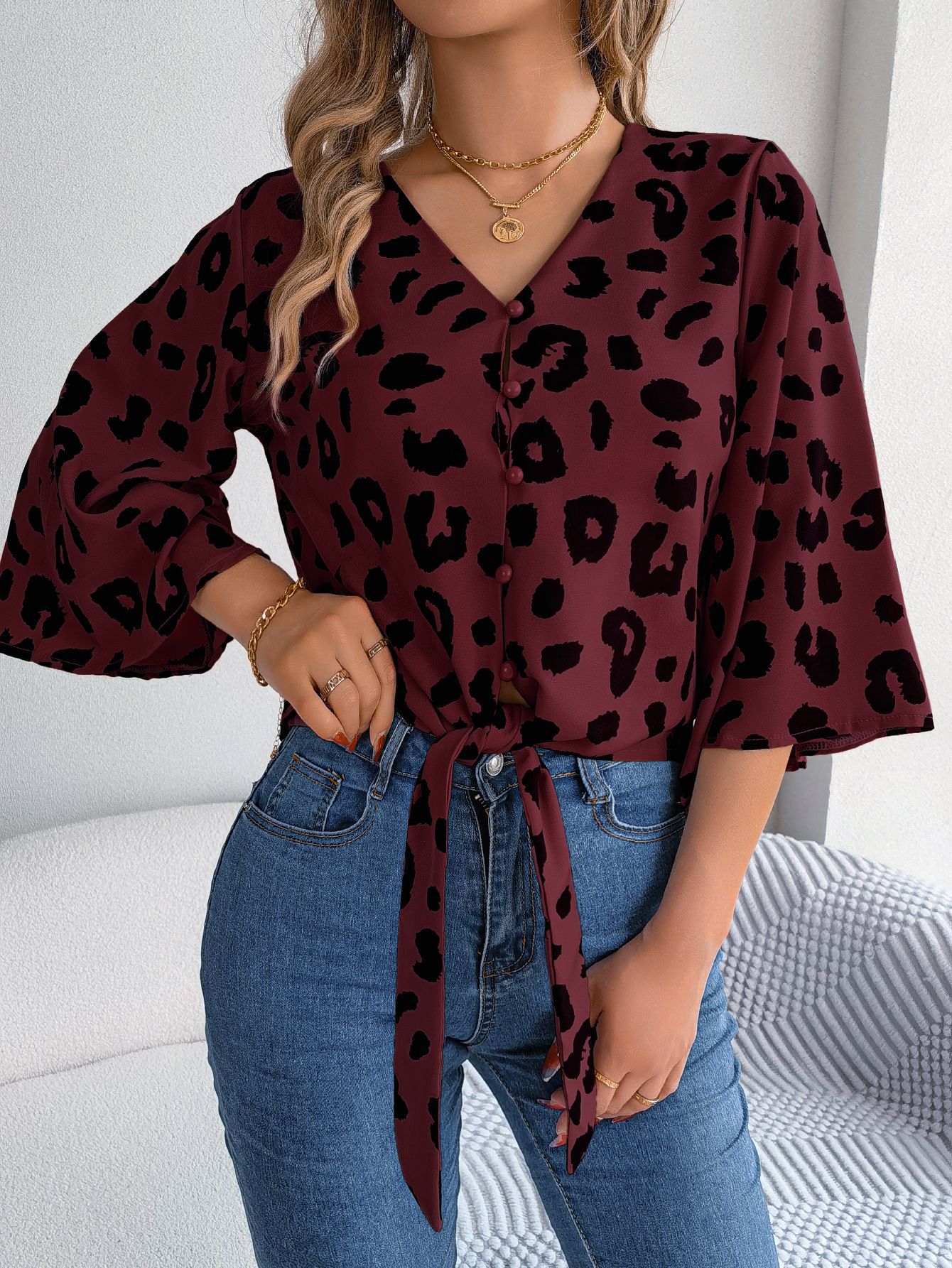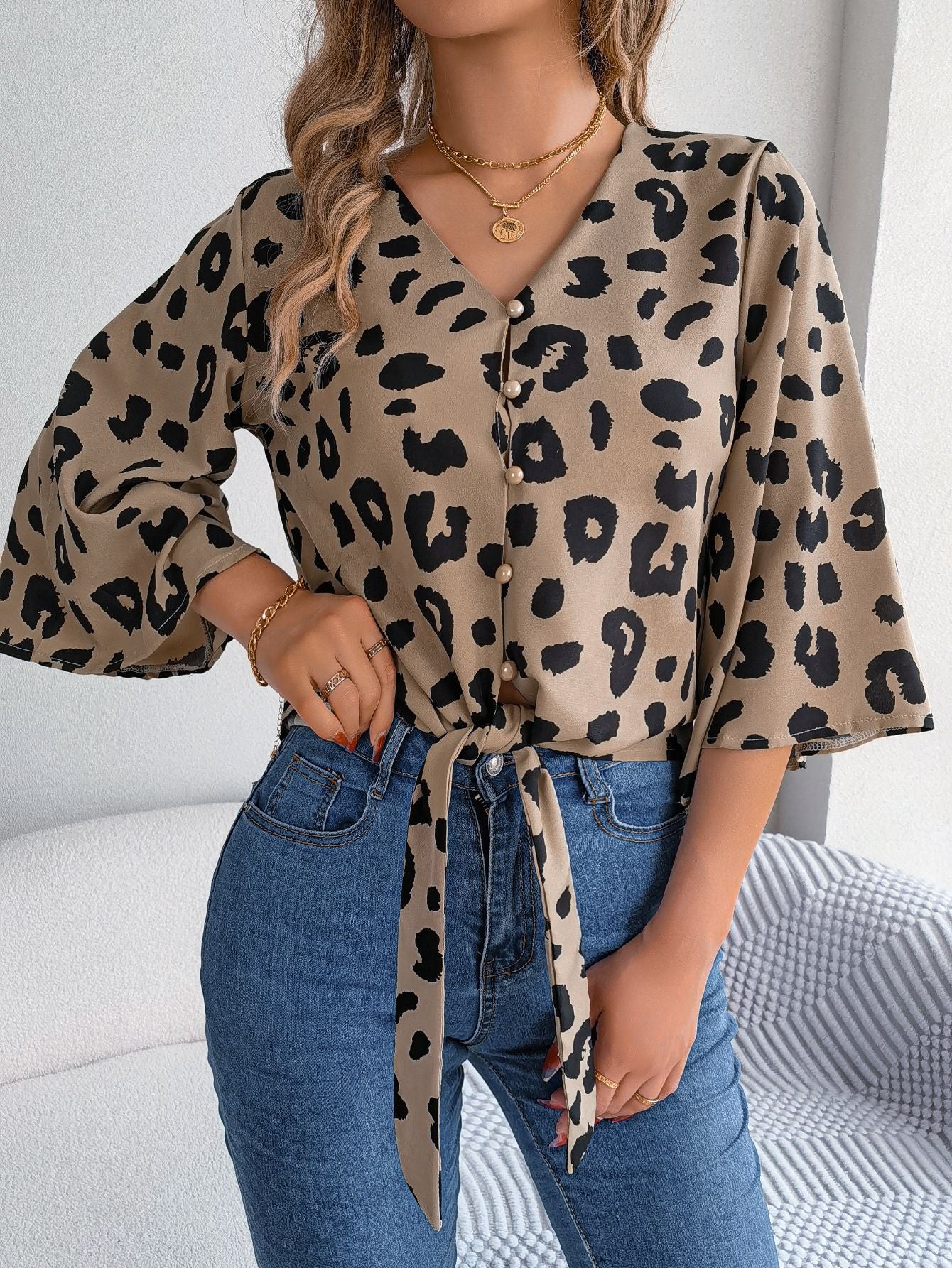 Women Casual Leopard Print Tie Chiffon Blouse Top