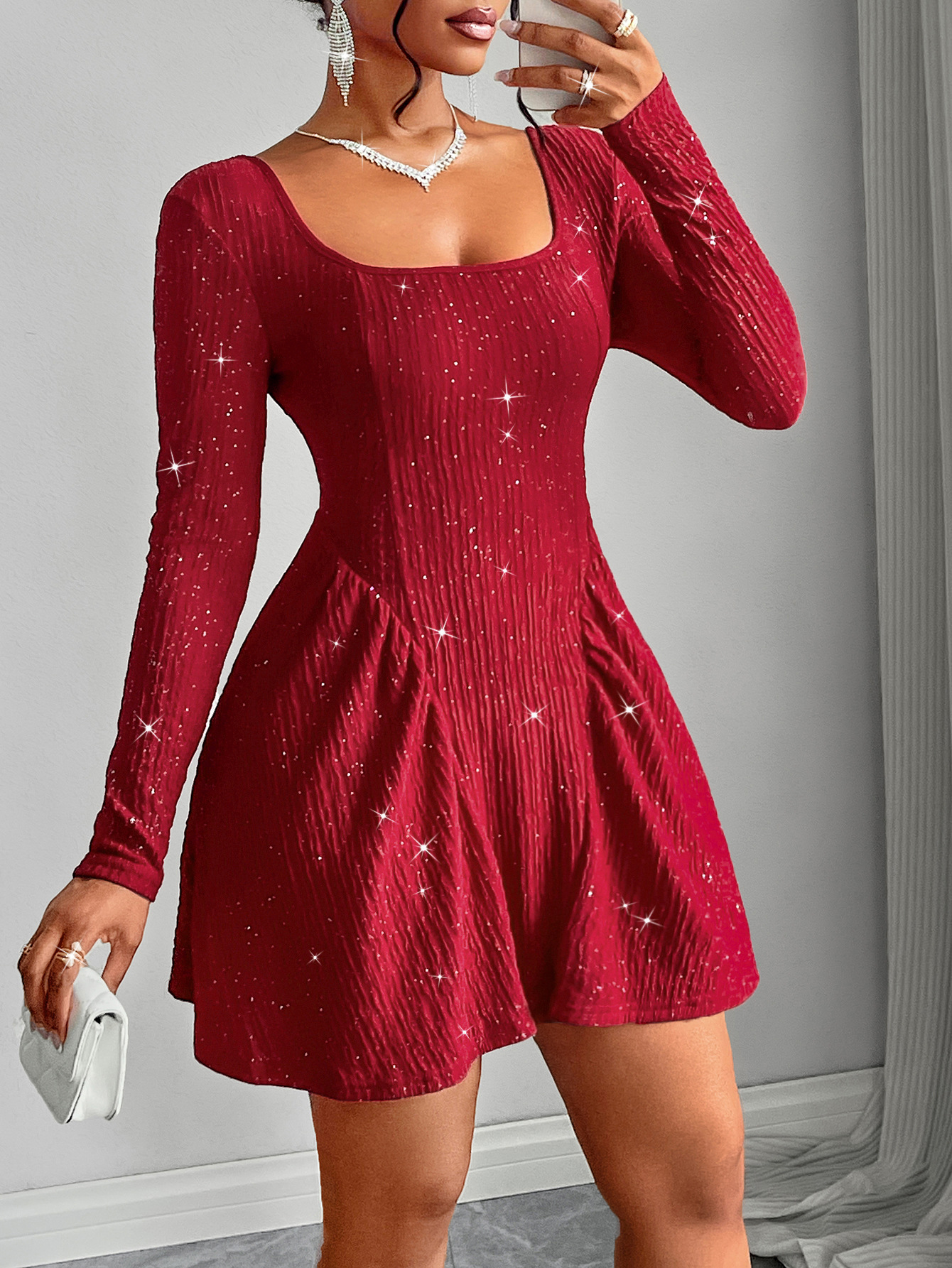 Women's Clothing Long Sleeve Square-neck Dress