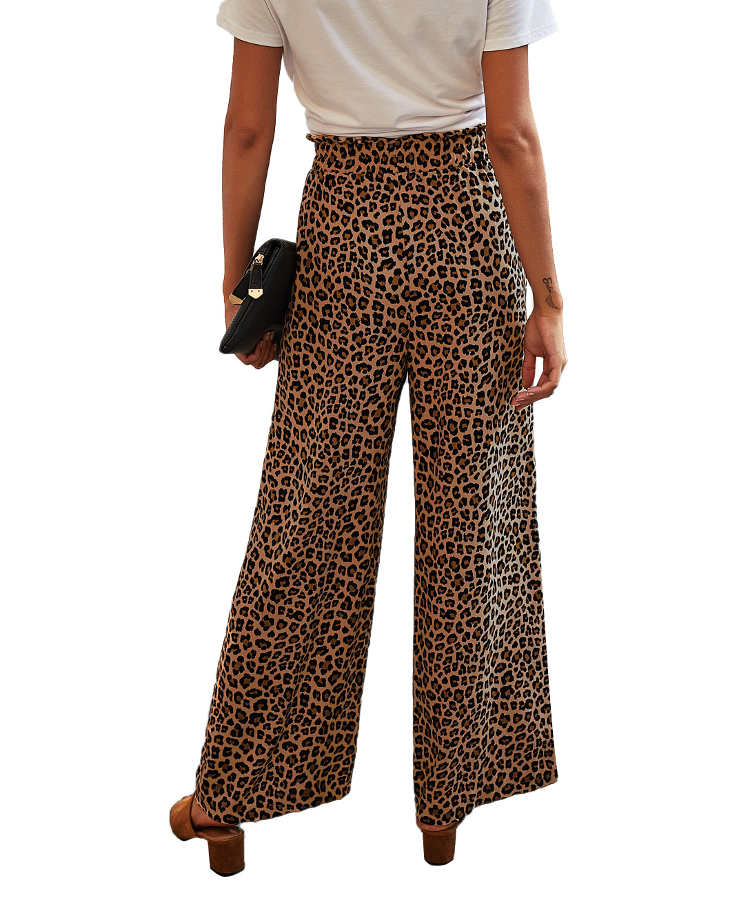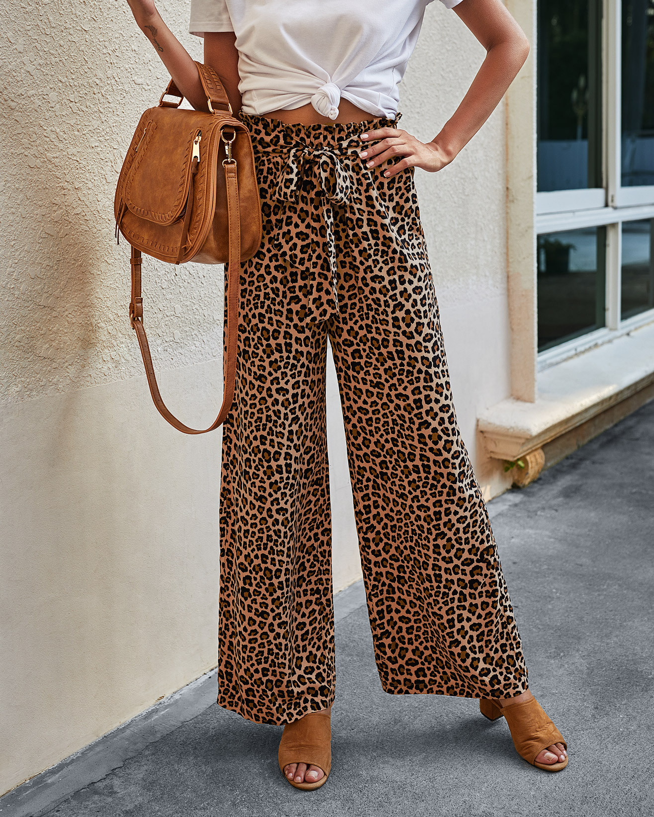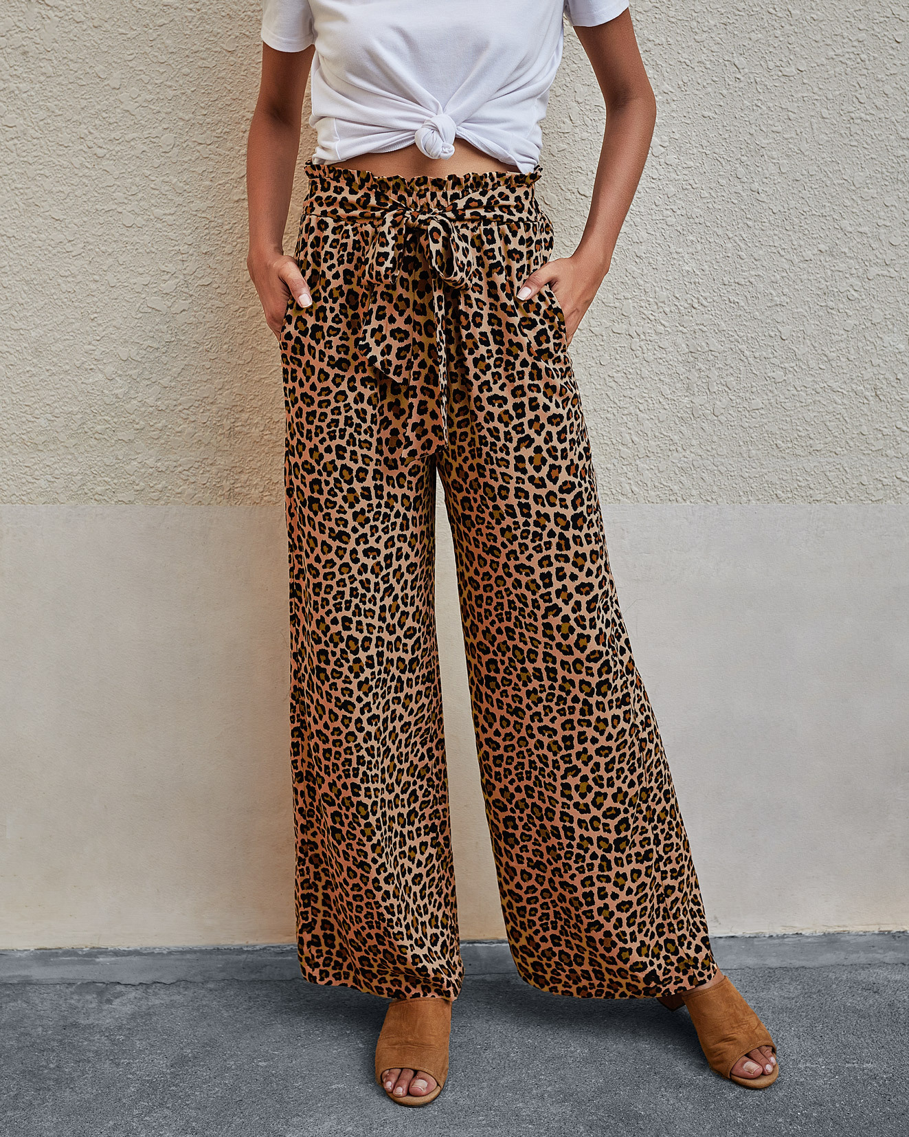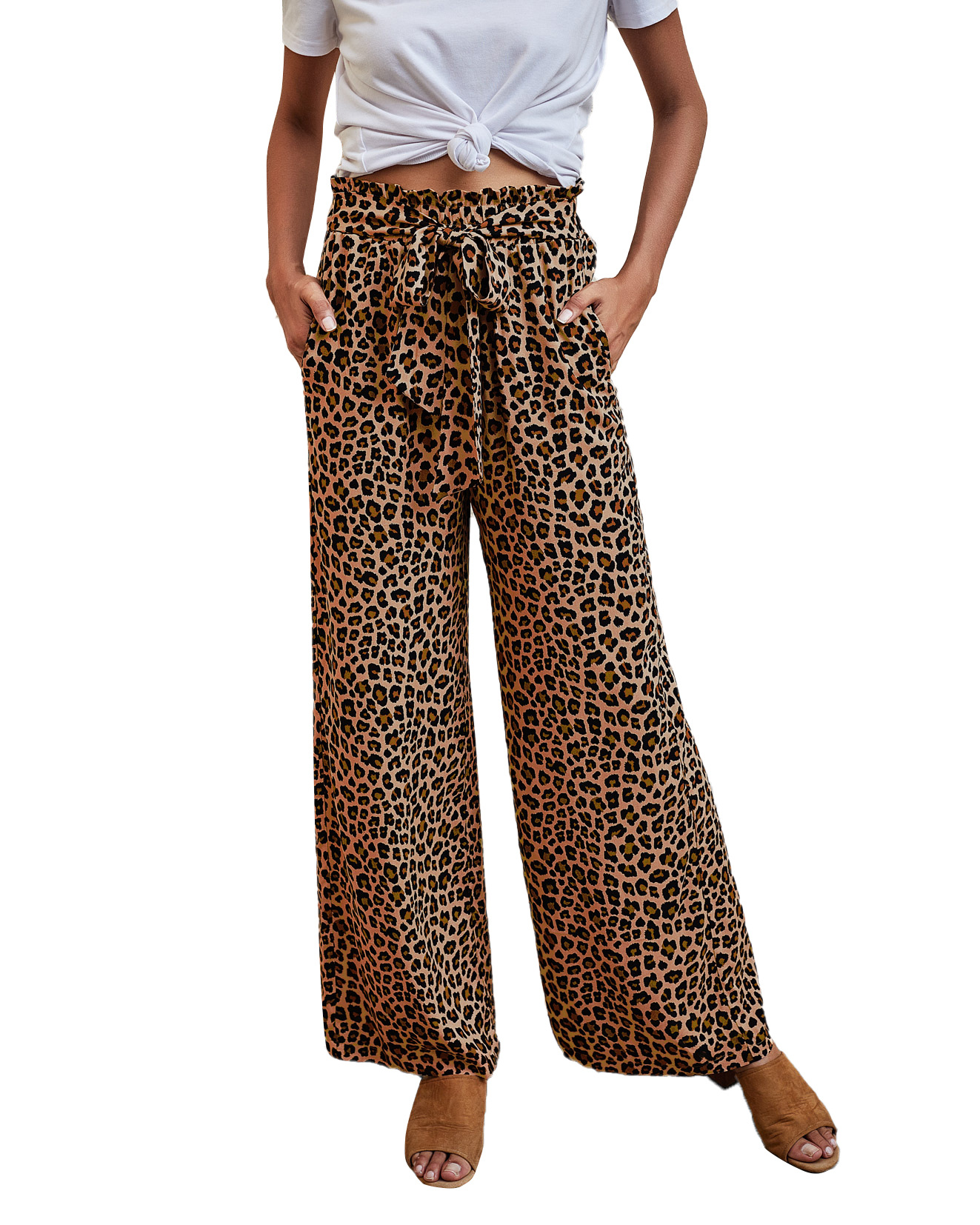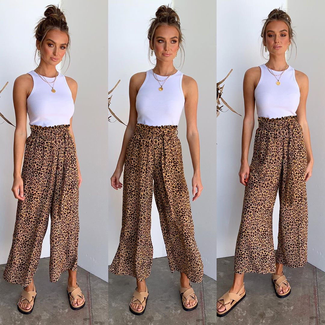 • Women's Fashionable Leopard Print Lace-up Wide-leg Trousers