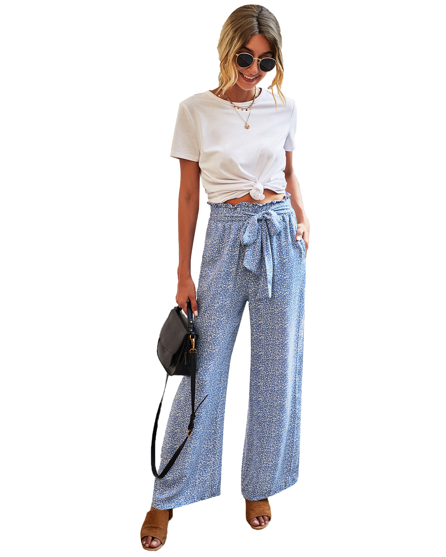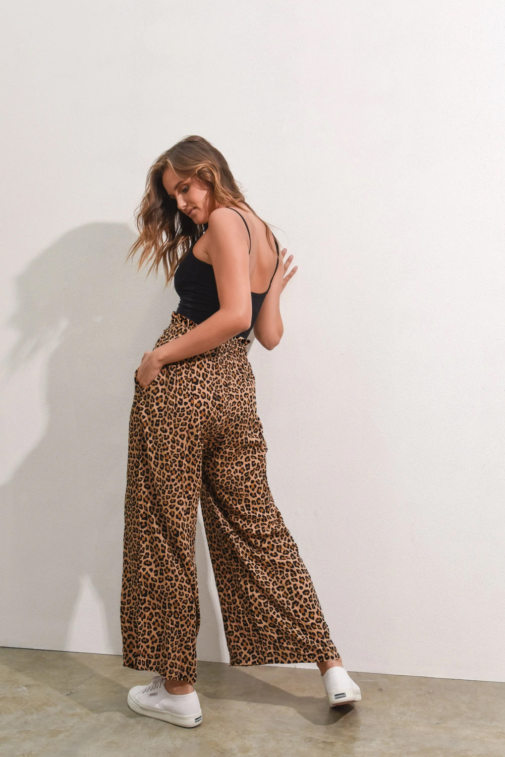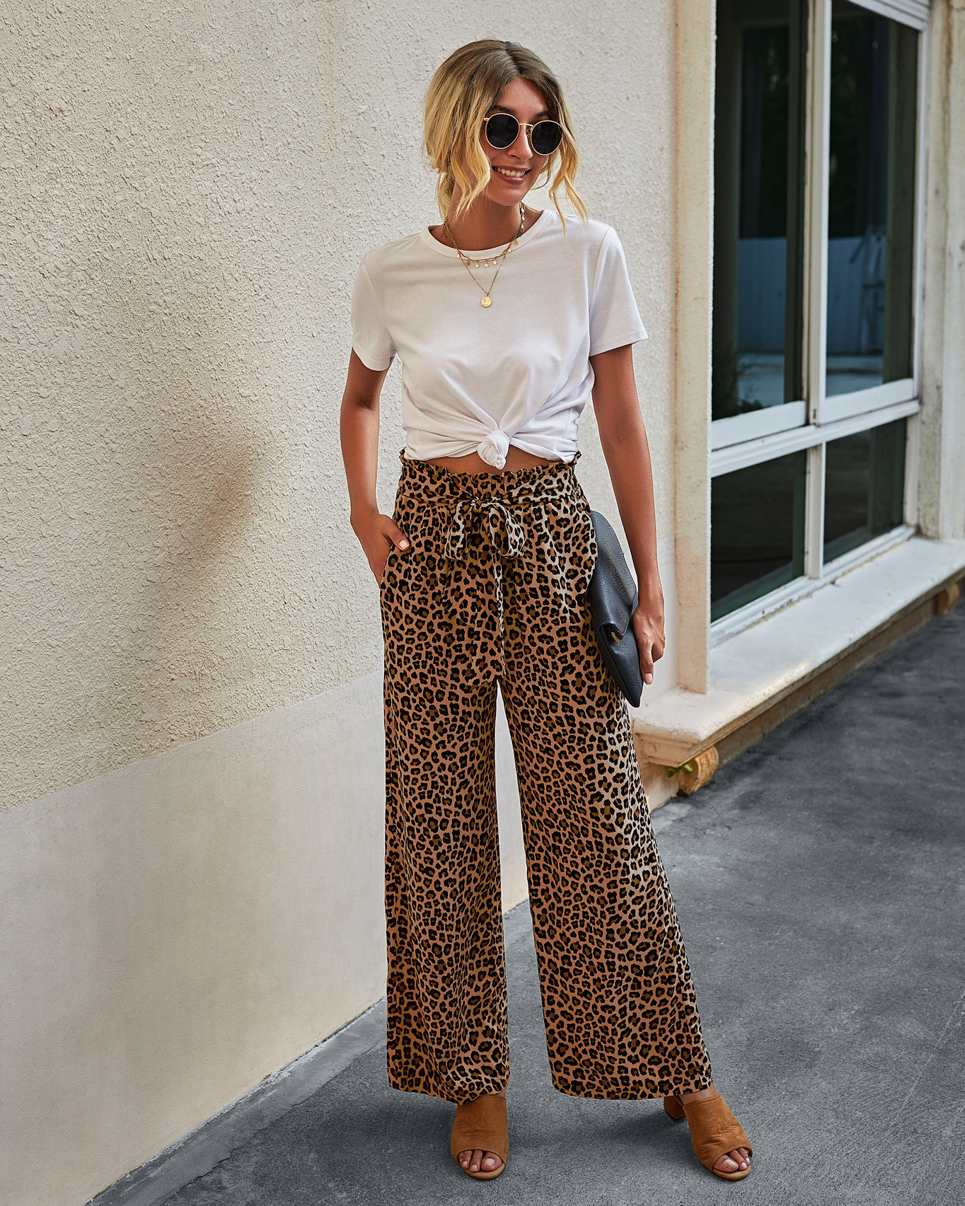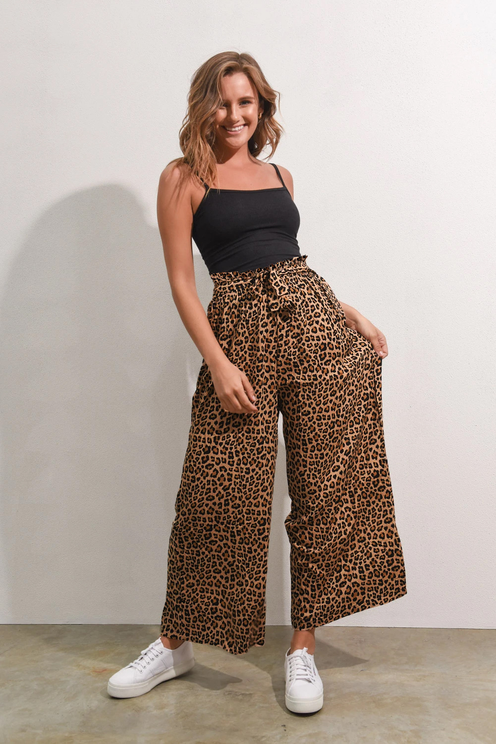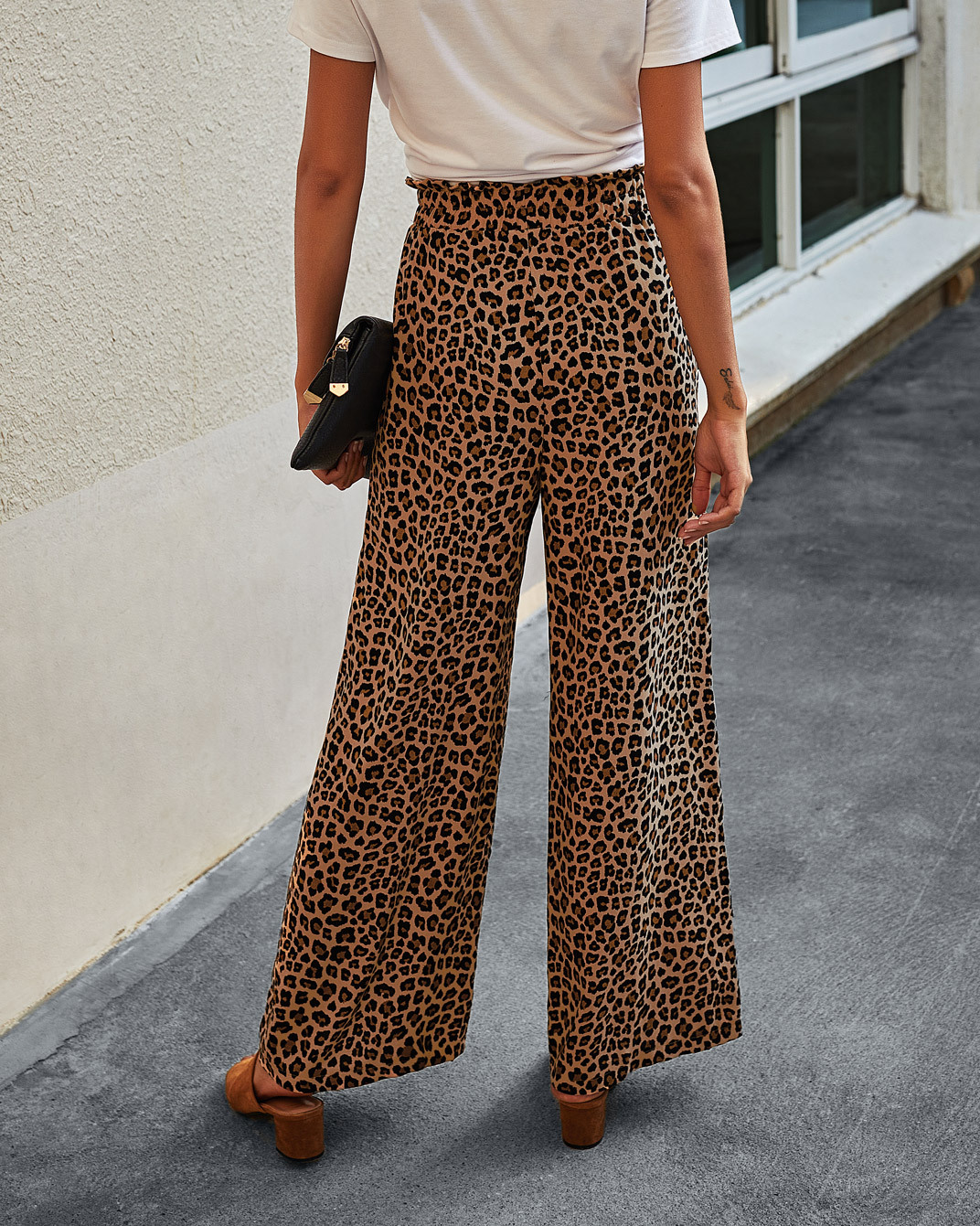 • Women's Fashionable Leopard Print Lace-up Wide-leg Trousers