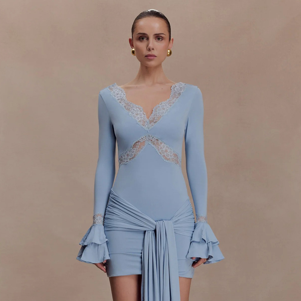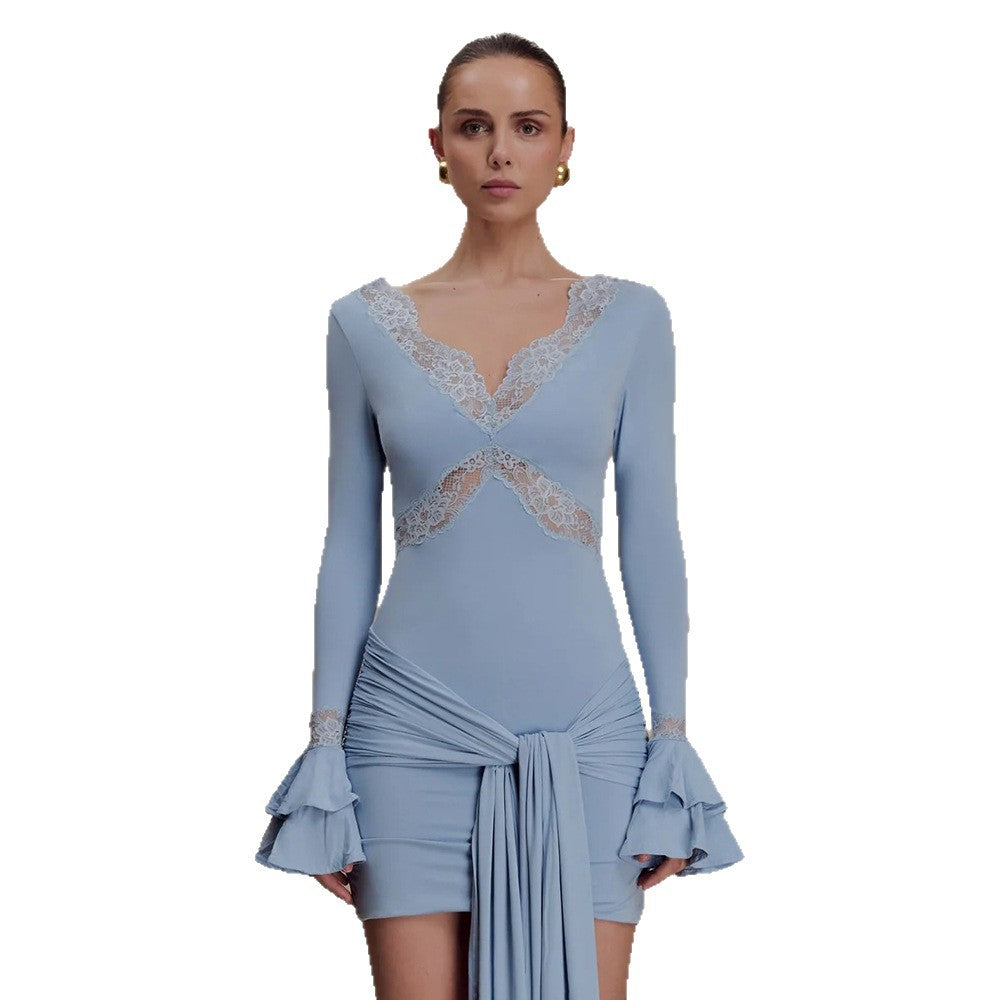 • Womens Lace-trimmed Flare-sleeve Bodycon Backless Dress