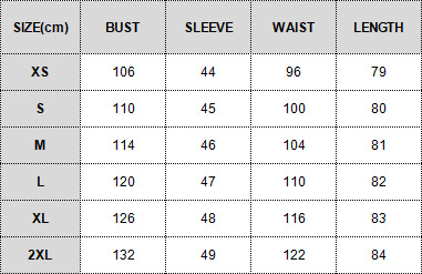 Sizes: XS, S, M, L, XL, XXL