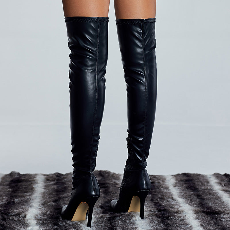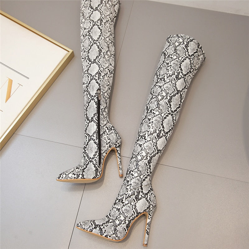 These snake print  boots are what we all need in our  shoe-drobe. Featuring  a inside zip fastening and long length. this style will elongate your sexy legs. Pair these  super chic thigh-highs with  a loose over-sized tee or a tight sexy dress to make an extreme statement outfit!